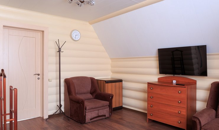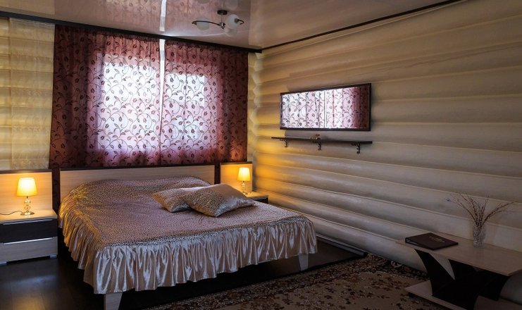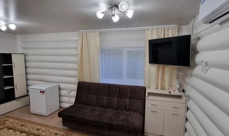 В коттедже: диван, зеркало, две кровати двуспальные, прикроватные тумбочки, стол, стулья, шкаф, мини-кухня, кондиционер, микроволновая печь, мини-холодильник, набор посуды, сейф, телевизор ЖК, электрочайник