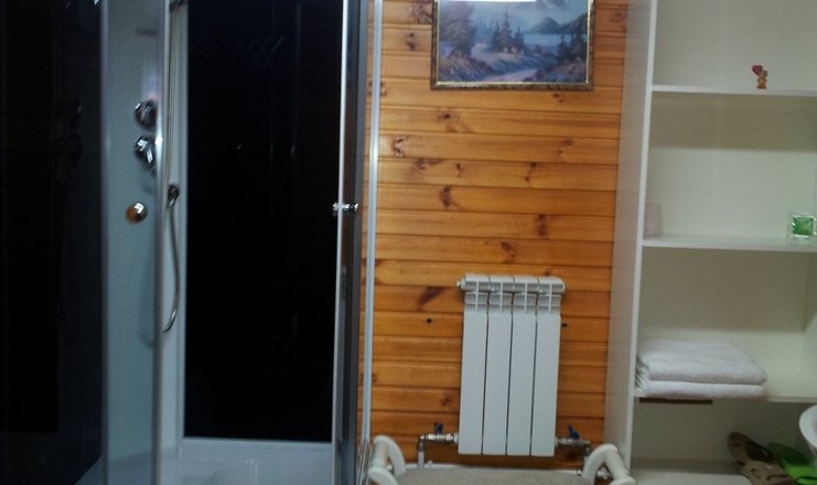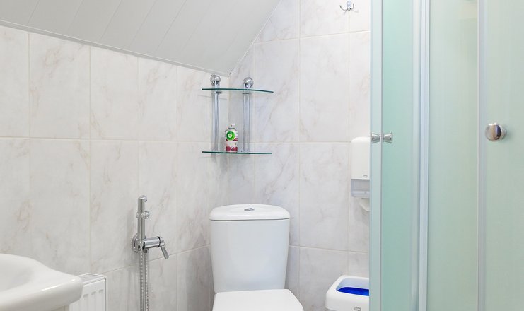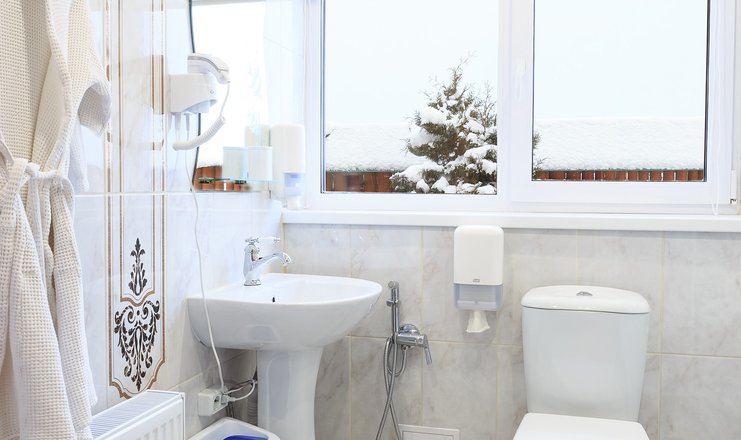 Санузел: душ, раковина, унитаз, тапочки, туалетные принадлежности, фен, халат