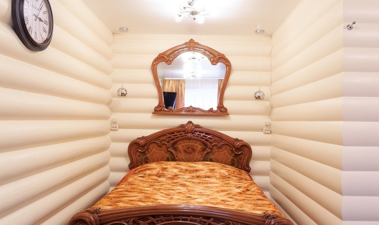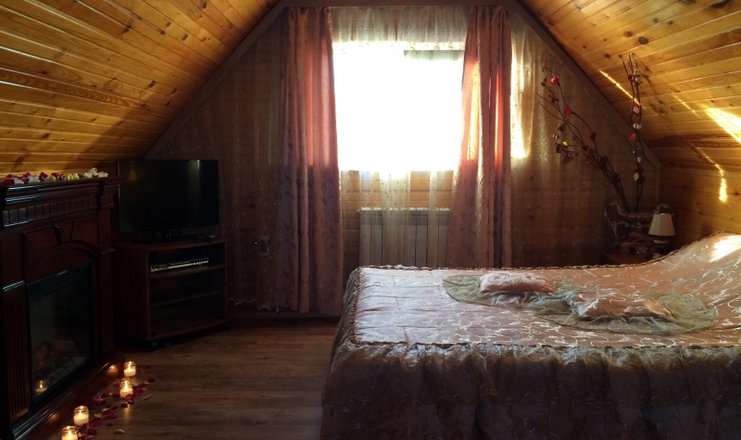 В коттедже: диван, зеркало, кровать двуспальная, прикроватные тумбочки, стол, стулья, шкаф, мини-кухня, кондиционер, микроволновая печь, мини-холодильник, набор посуды, сейф, телевизор ЖК, электрочайник