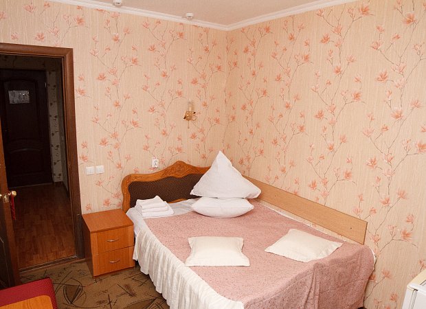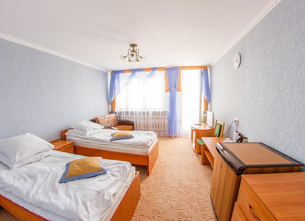 В номере: две односпальные или двуспальная кровать,прикроватные тумбы, стул, стол, диван, комод, телевизор, интернет wi-fi