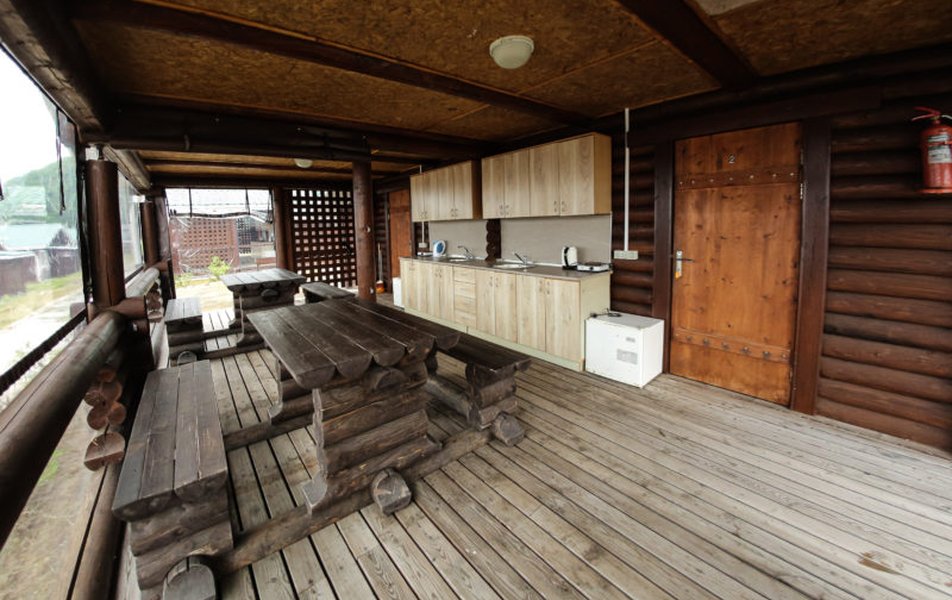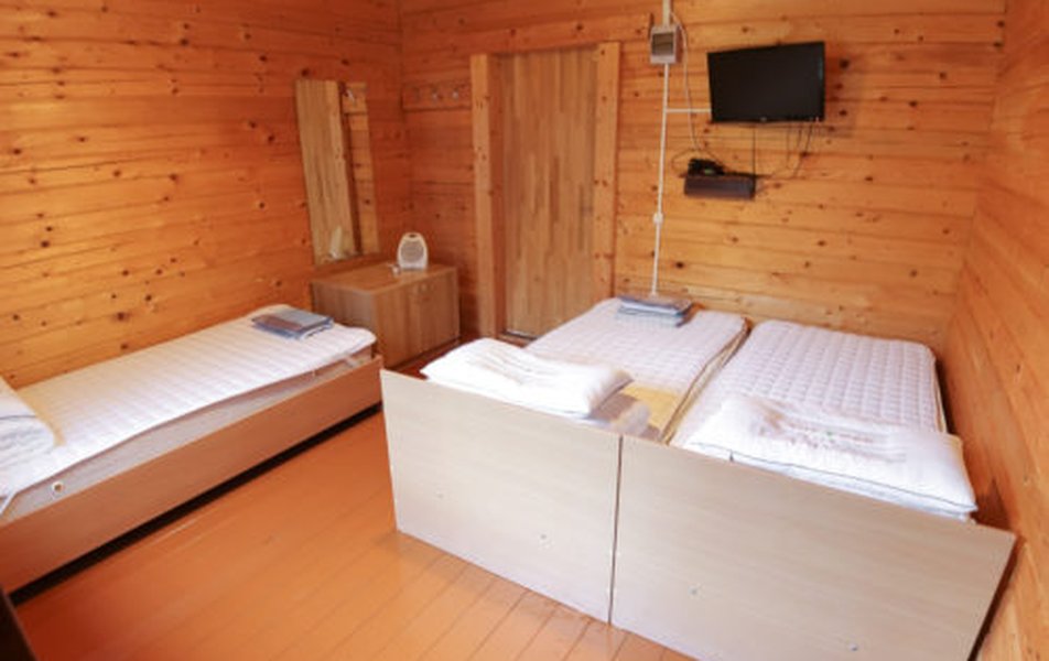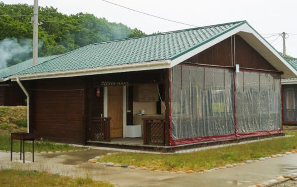 В домике: кровати односпальные, кухонная мебель, прикроватные тумбочки, стол, стулья, мини-кухня, мини-холодильник, набор посуды, плита электрическая, телевизор, электрочайник