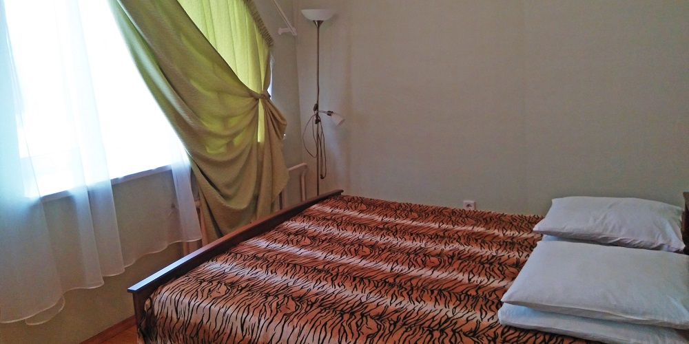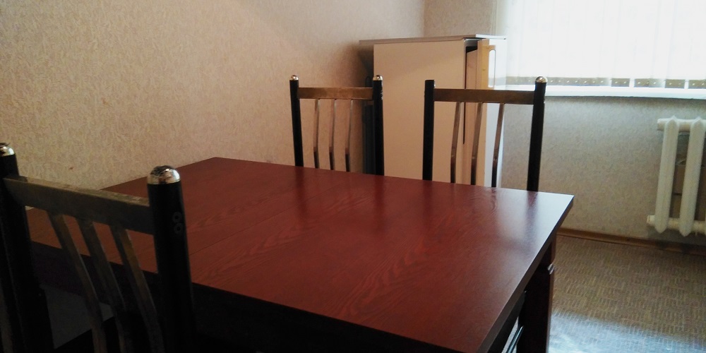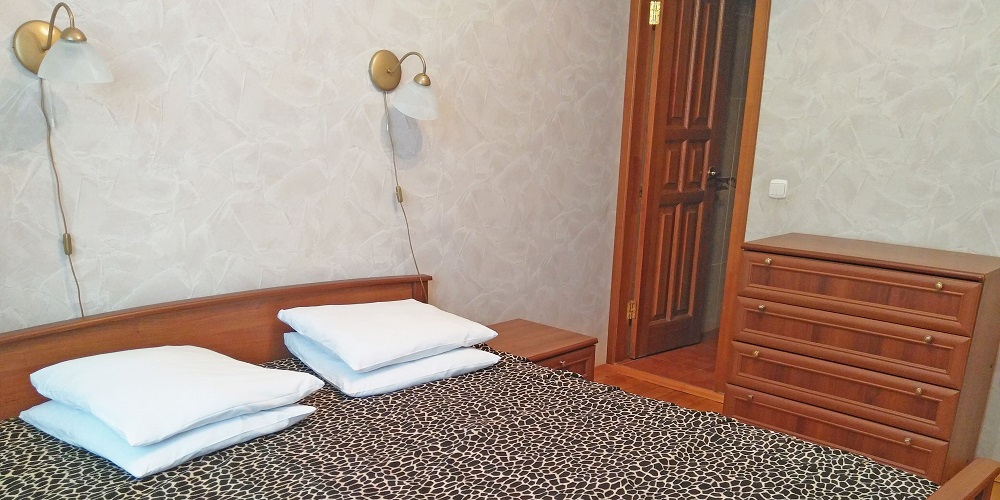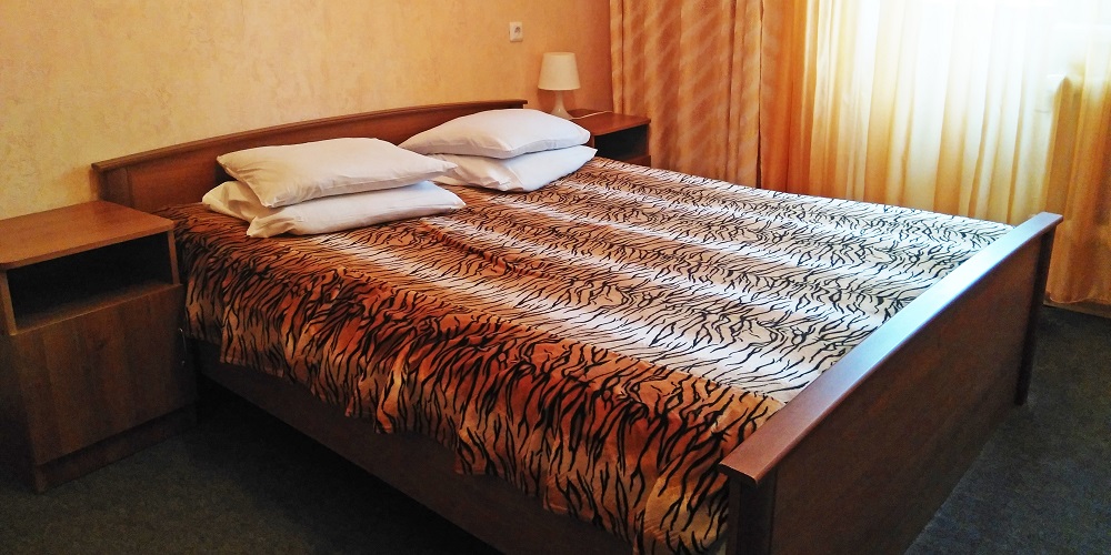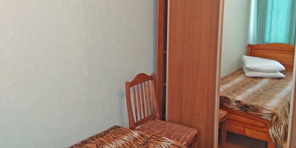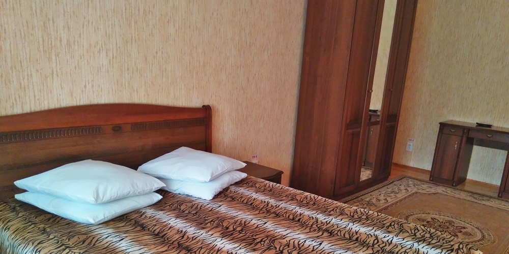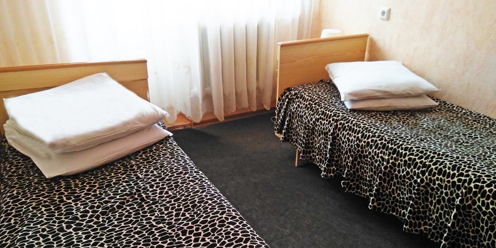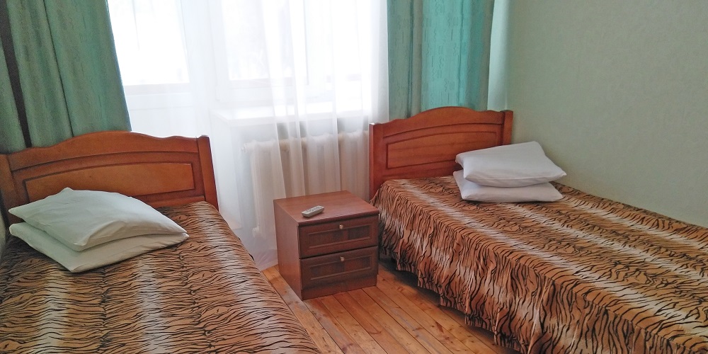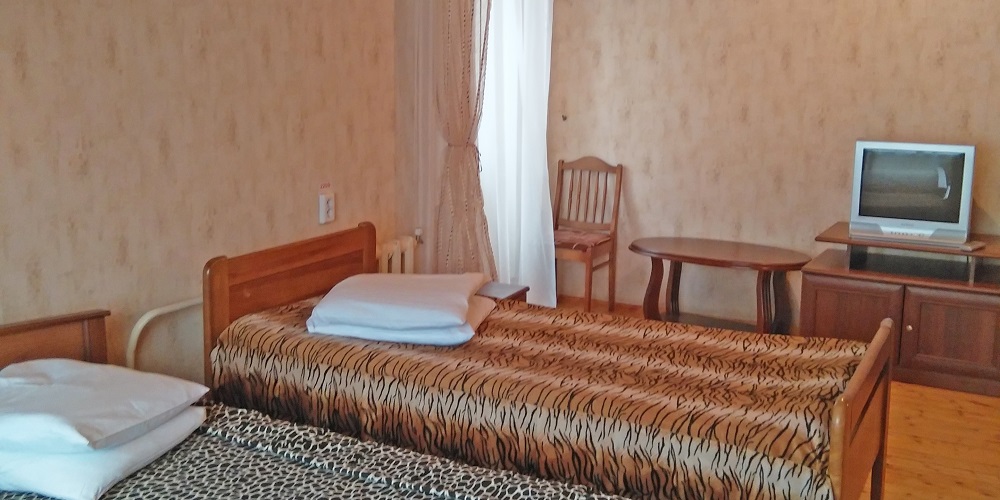 В номере: две односпальные кровати, прикроватные тумбы, стол, стулья, шкаф-купе, холодильник, телевизор