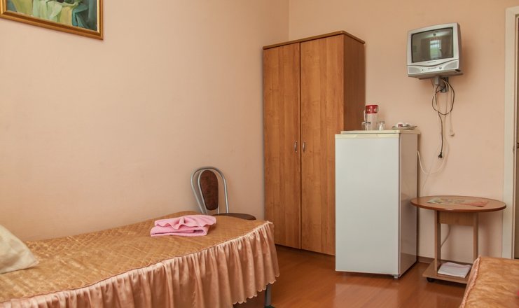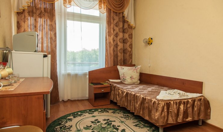 В номере: кровать односпальная, прикроватная тумбочка, столик туалетный, стул, шкаф, телевизор, холодильник, чайный набор посуды, электрочайник