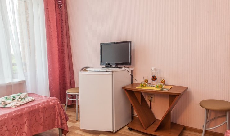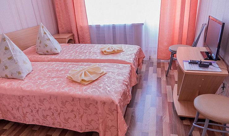 В номере: кровати односпальные или одна двуспальная, прикроватные тумбочки, столик туалетный, стул, шкаф, телевизор, холодильник, чайный набор посуды, электрочайник
