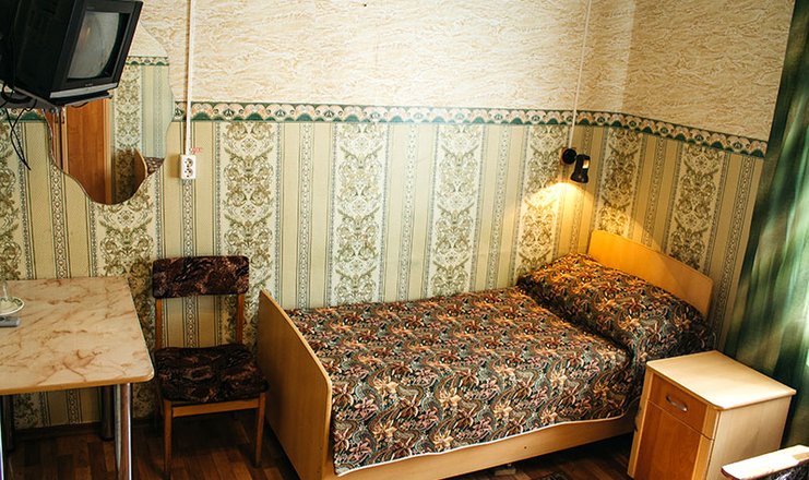 Оснащение номера: односпальная кровать, прикроватная тумбочка, стол, стул, шкаф, зеркало, телевизор, утюг, электрочайник, холодильник (в холле)