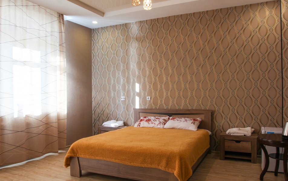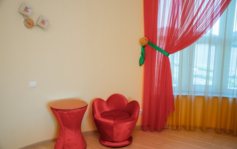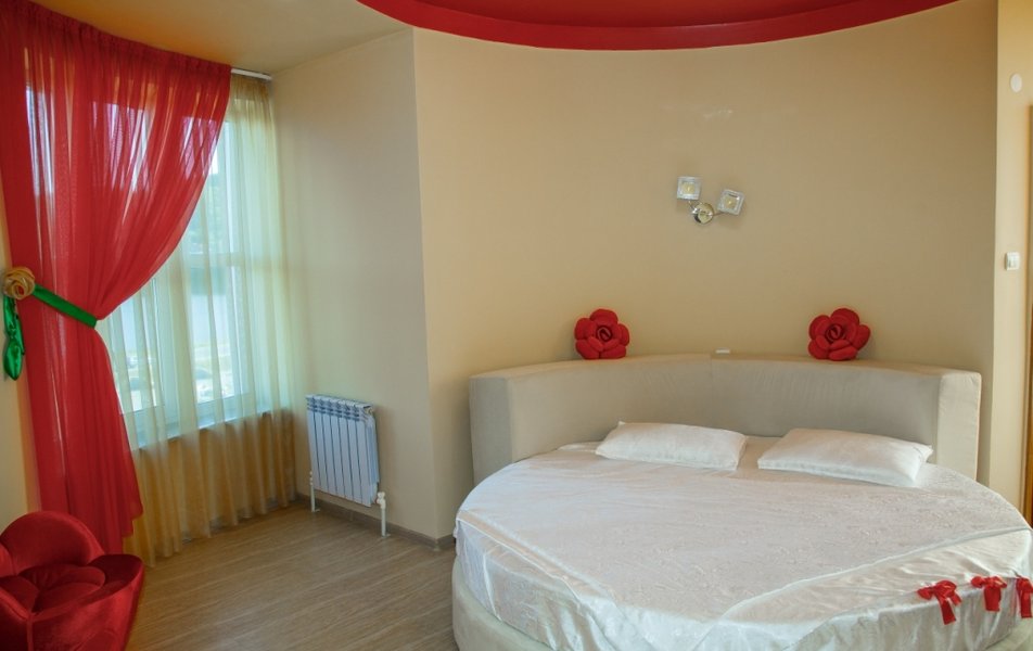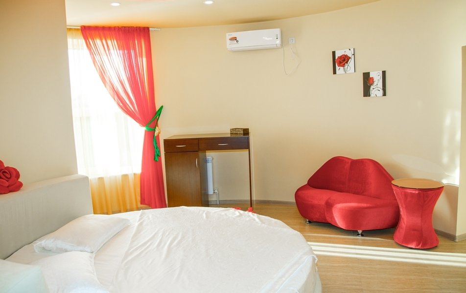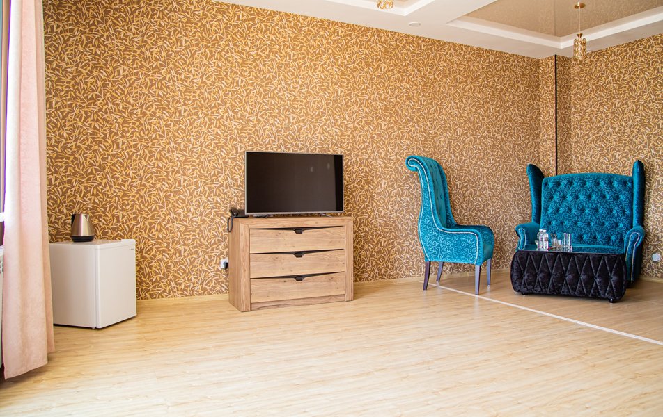 В номере: диван, кресла, кровать круглая, столик журнальный, шкаф, кондиционер, телевизор, холодильник, электрочайник