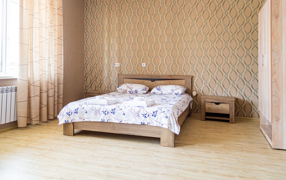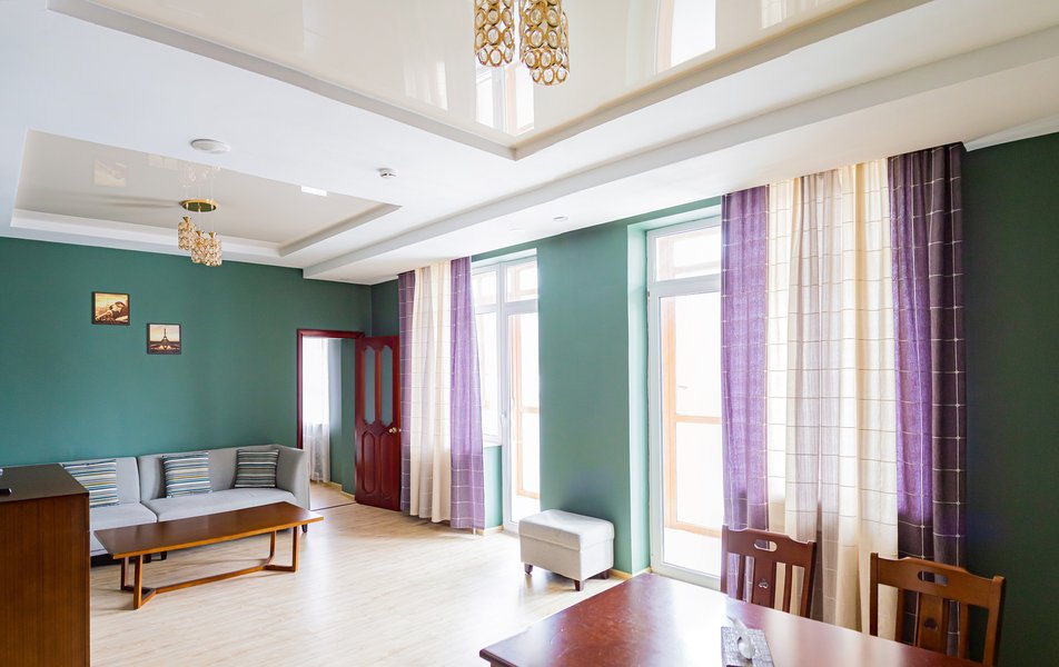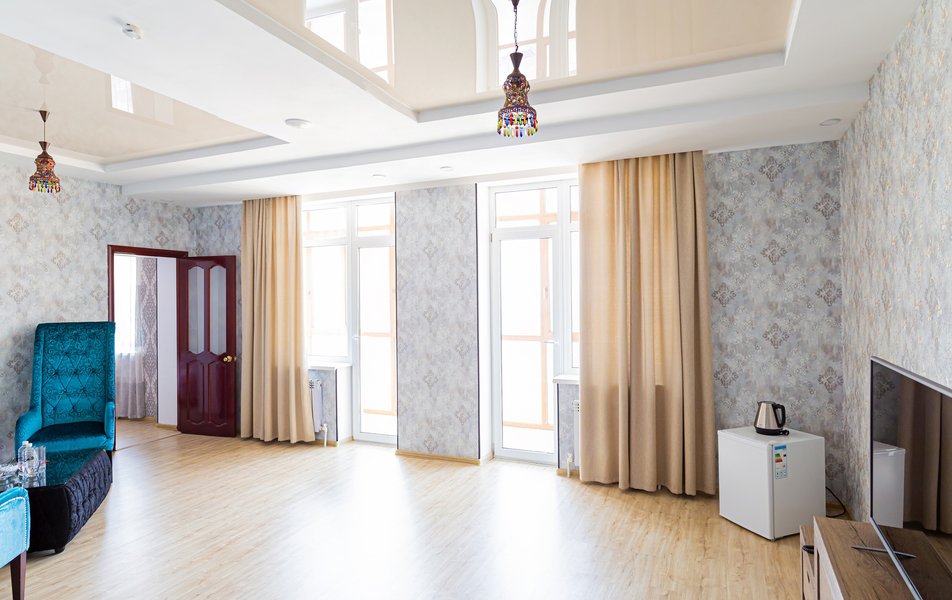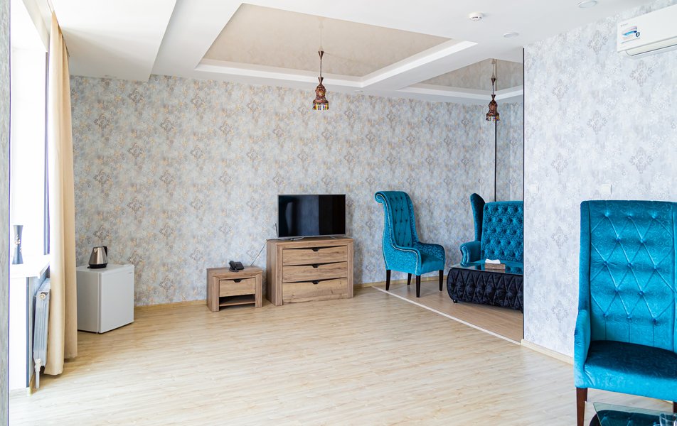В номере: комод, кровать двуспальная, набор мягкой мебели, столик журнальный, шкаф, кондиционер, телевизор, холодильник, чайный набор посуды, электрочайник