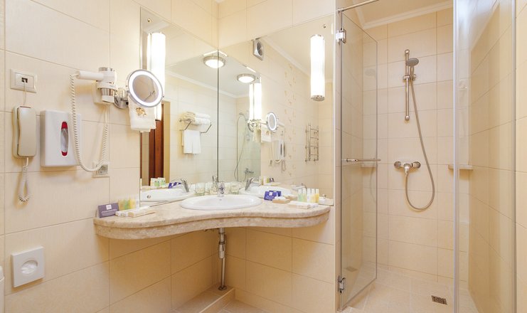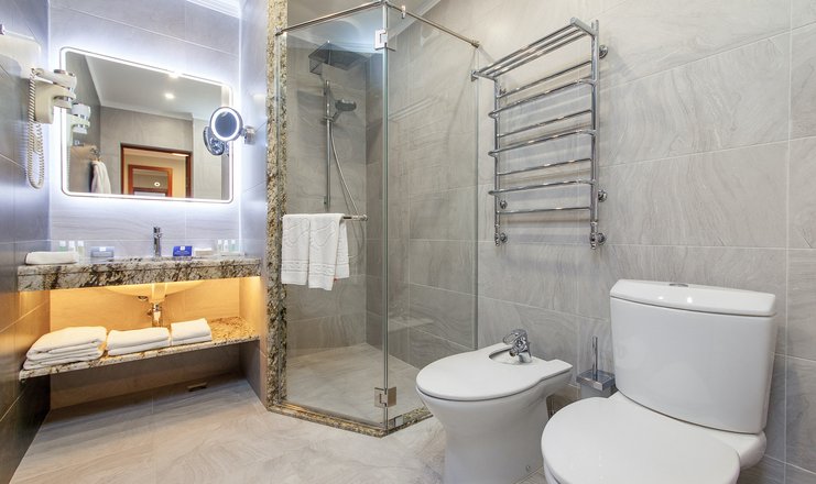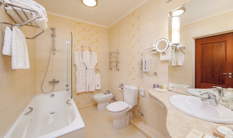 Санузел: душ, раковина, унитаз, биде, тапочки, туалетные принадлежности, фен, халат