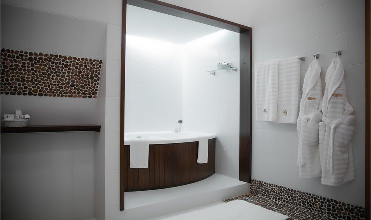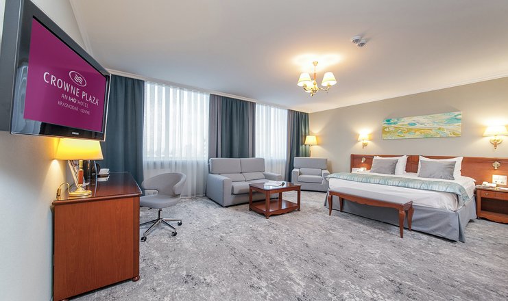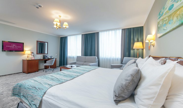 В номере: кровать двуспальная, прикроватные тумбочки, стол, стулья, шкаф, диван раскладной, кресло, кондиционер, сейф, телевизор, чайная станция