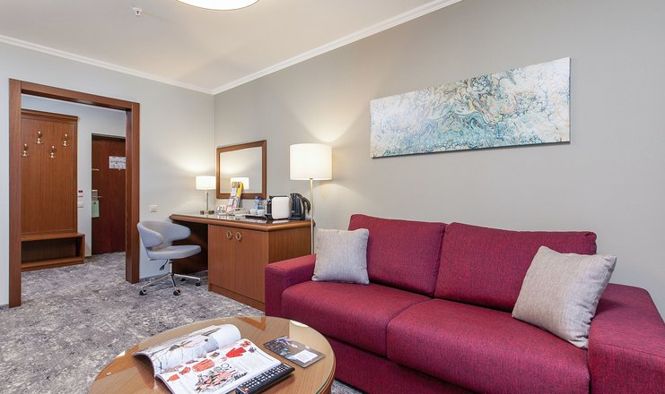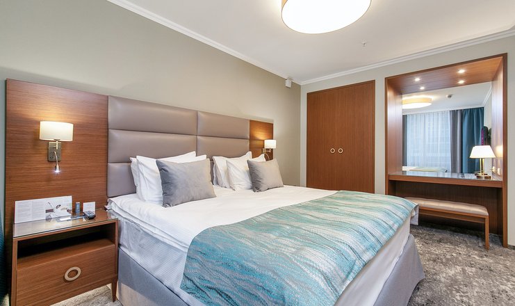 В номере: кровать двуспальная, прикроватные тумбочки, стол, стулья, шкаф, диван раскладной, журнальный столик, кондиционер, сейф, телевизор, чайная станция