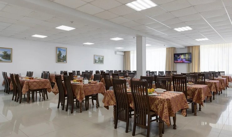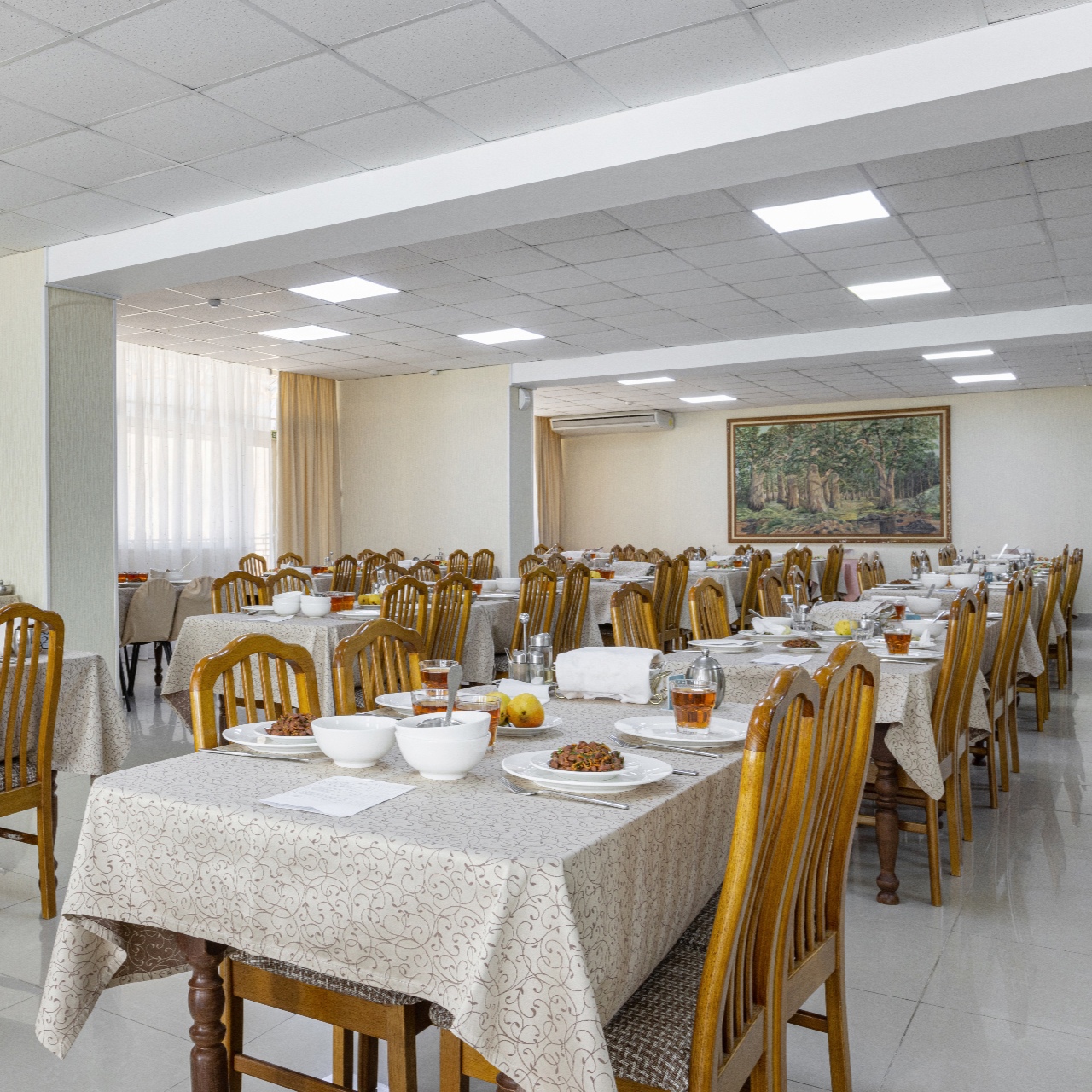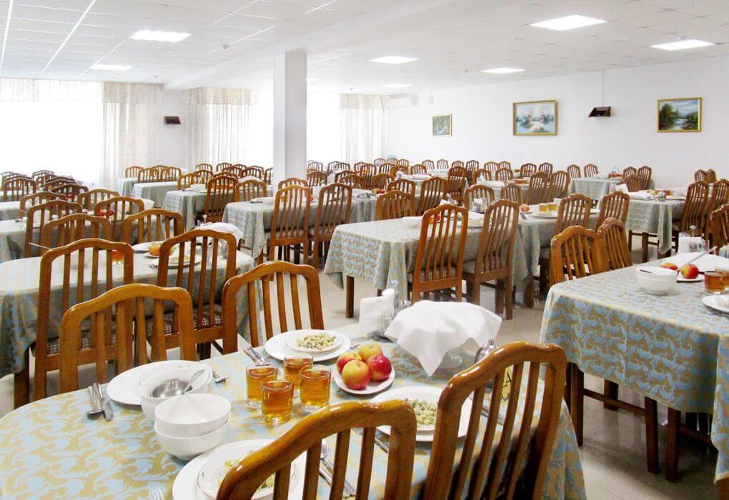 Санаторий предлагает разнообразные варианты диет, такие как высокобелковая 11, низкобелковая 7б, 7а, а также щадящие диеты механического и химического направления. Для удобства питания детей в столовой имеются детские стульчики. Кроме того, отдыхающим доступны услуги кафе "Бочка", где можно насладиться блюдами кавказской и европейской кухни. Все блюда готовятся из экологически чистых продуктов, выращенных в естественных условиях без использования химических стимуляторов роста и других биотехнологий.