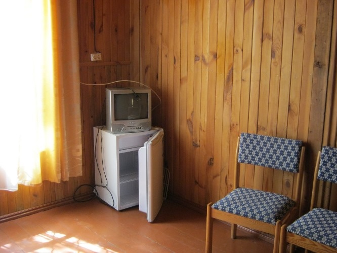 В номере: вешалка, кровати односпальные /одна двуспальная кровать, стол, стулья, шкаф, телевизор, холодильник, чайный набор посуды