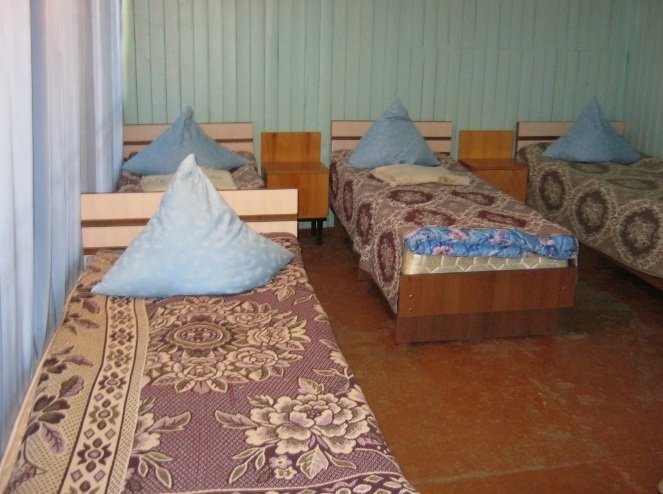 В номере: кровать односпальная: (три), прикроватные тумбочки, стол, стулья, шкаф, набор посуды