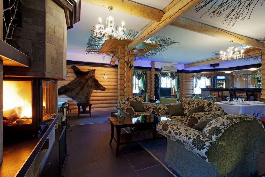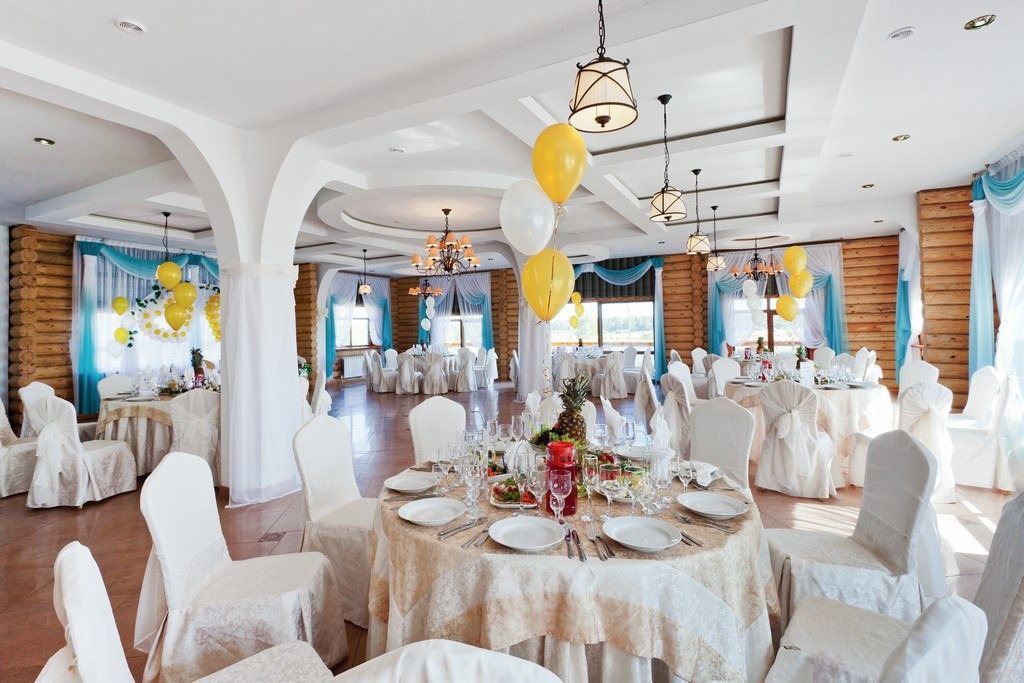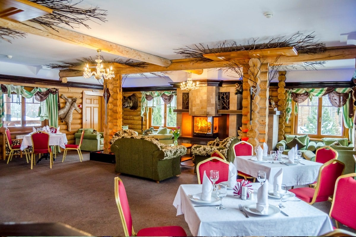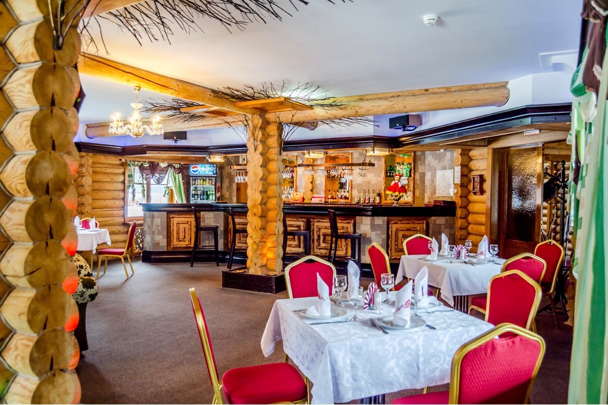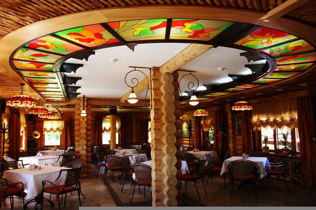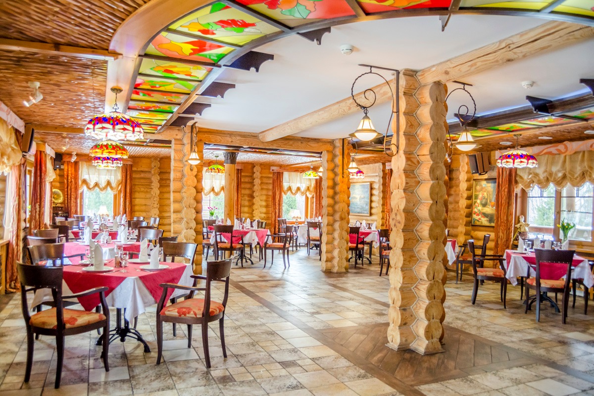 Свадьба может быть устроена как в ресторанах отеля, или Каминном зале, так и на улице в специально установленных шатрах — все зависит от времени года и пожеланий молодоженов. Интерьер ресторана «Буффет» выполнен в традиционном славянском стиле. Здесь каждый чувствует себя, как дома – спокойно и уютно, атмосфера располагает к приятным беседам.
