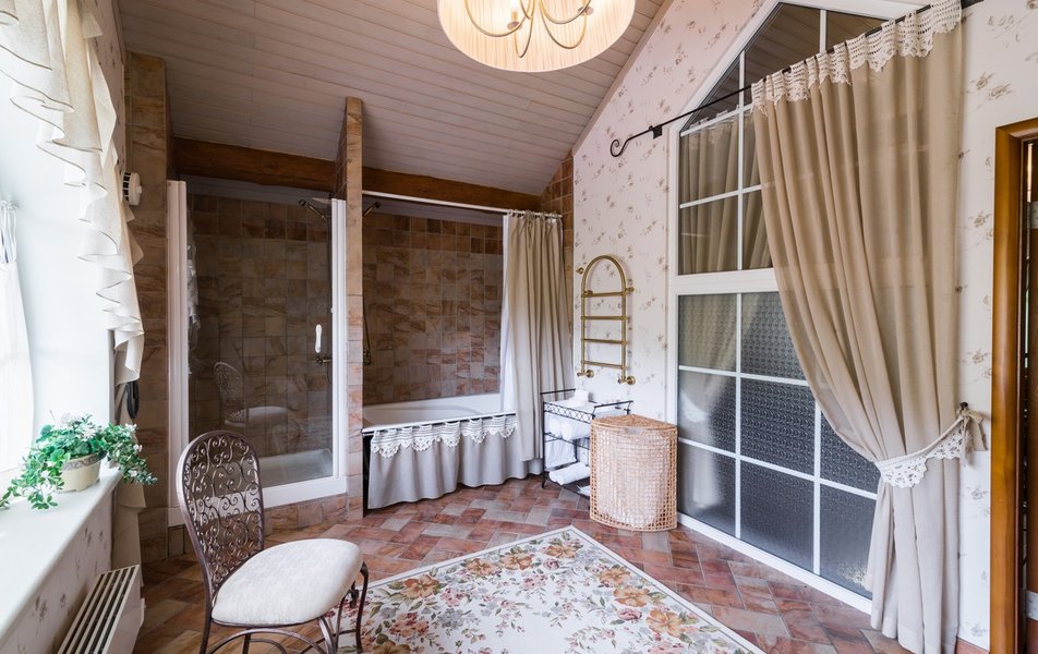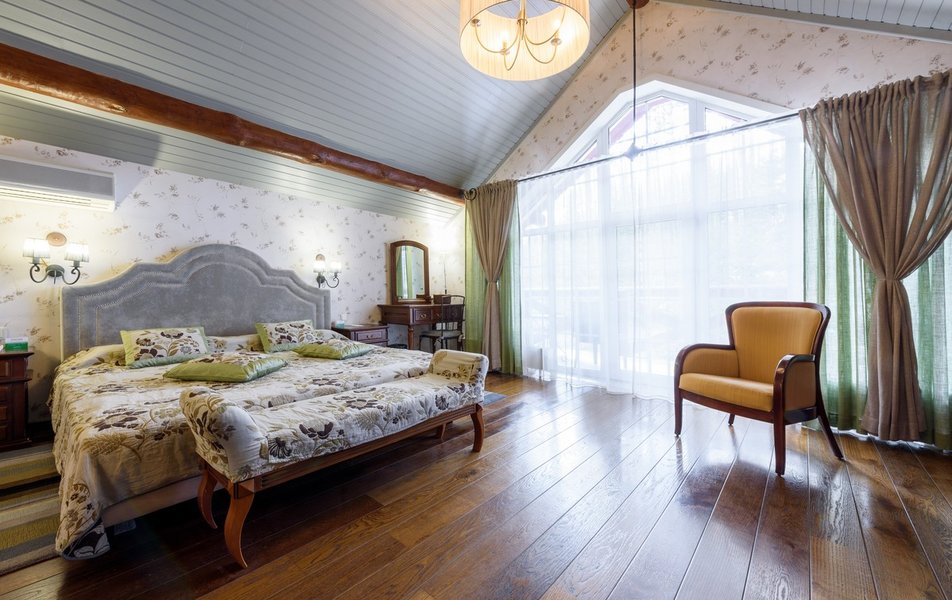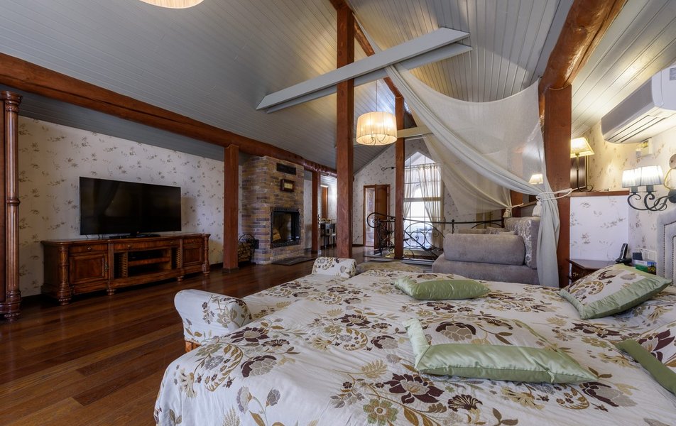 В номере: вешалка, диван, зеркало, комод, кровать двуспальная, прикроватные тумбочки, стол, столик журнальный, столик туалетный, стулья, шкаф, гладильная доска, камин, кондиционер, набор посуды, стиральная машина, телевизор ЖК, телефон, утюг, холодильник, чайный набор посуды, электрочайник
