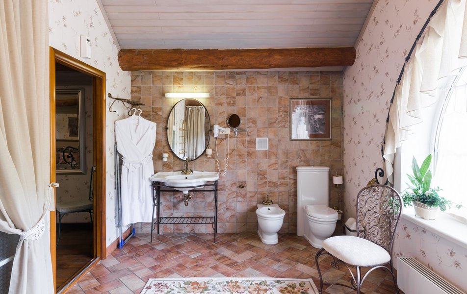 Санузел: ванна, душевая кабина, раковина, унитаз, биде, тапочки, туалетные принадлежности, фен, халат