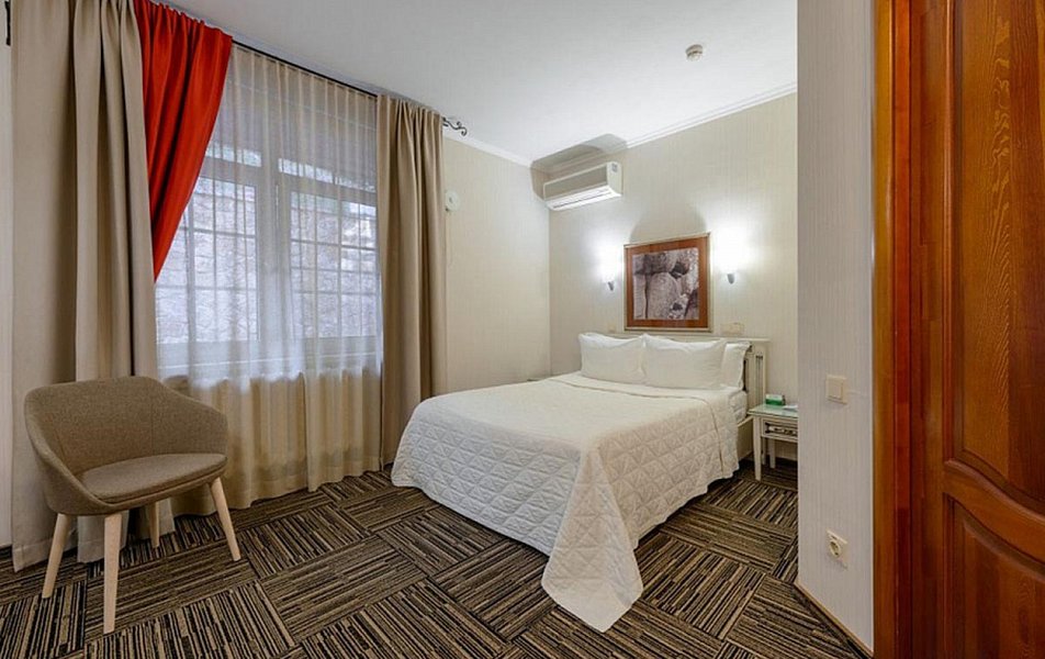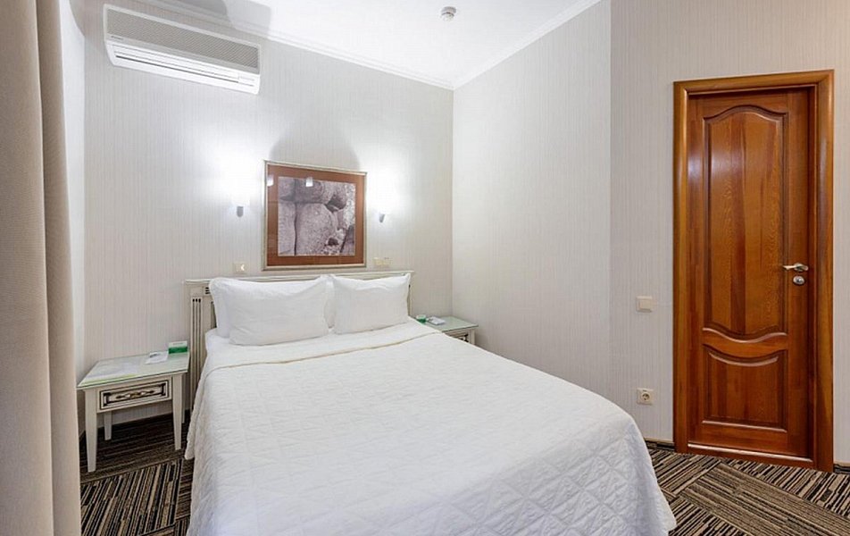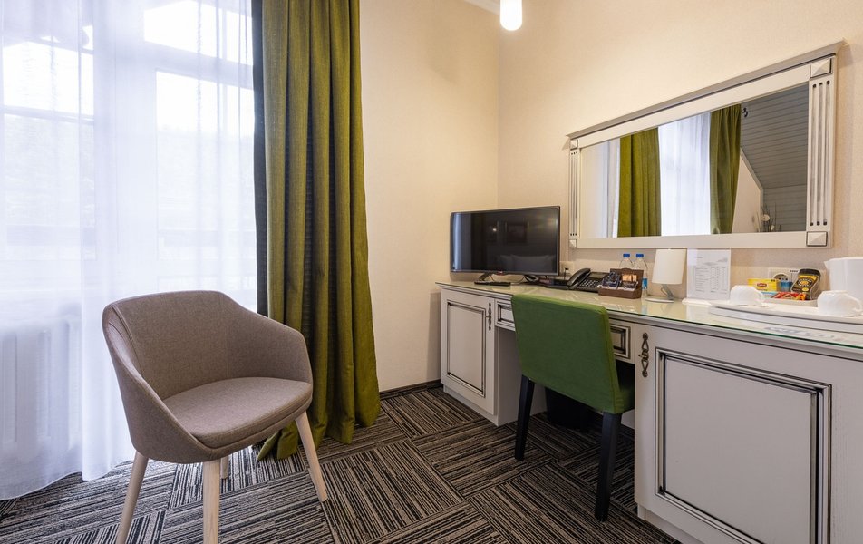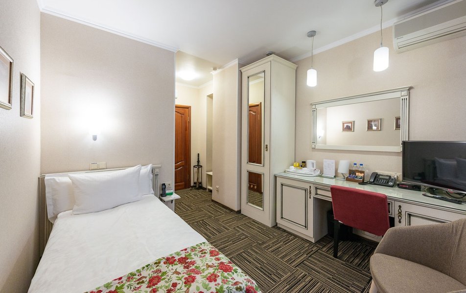 В номере: вешалка, зеркало, кровать односпальная, прикроватная тумбочка, столик туалетный, стул, шкаф, кондиционер, мини-холодильник, сейф, телевизор, чайный набор посуды, электрочайник