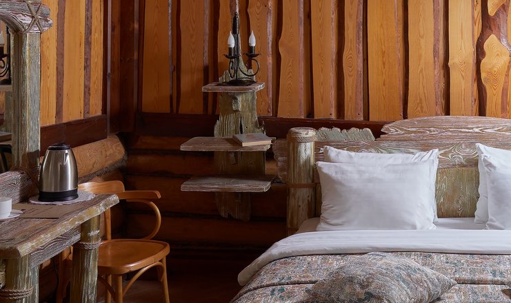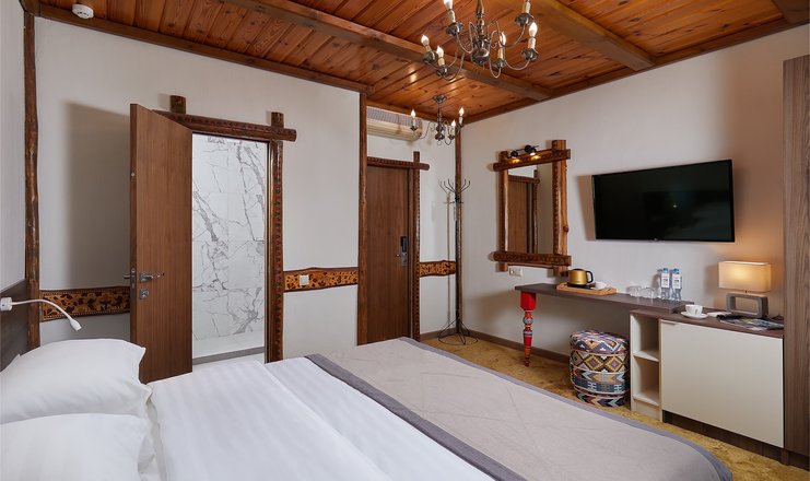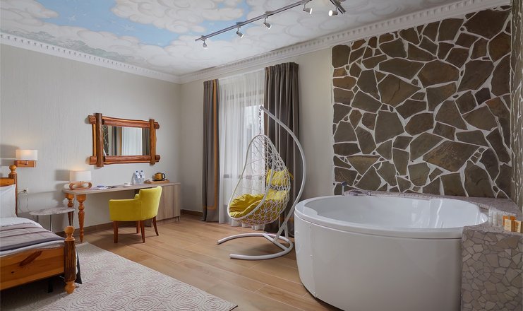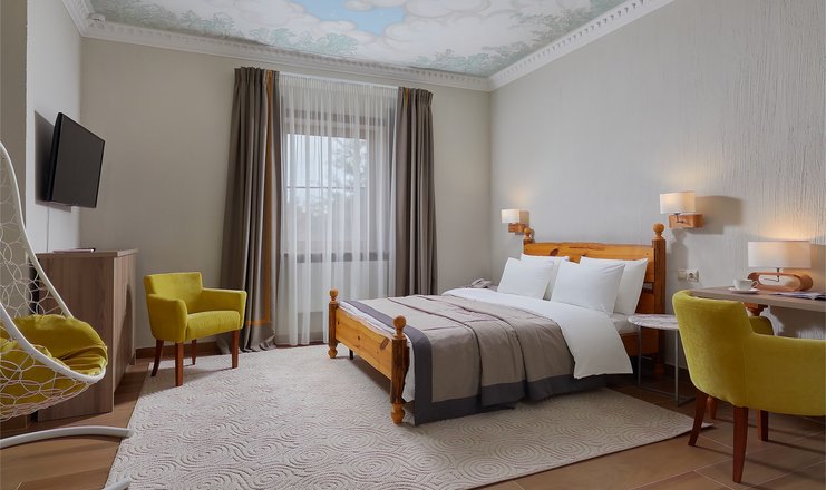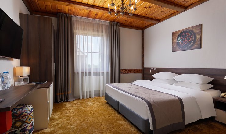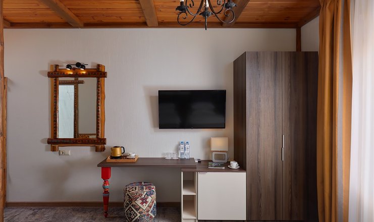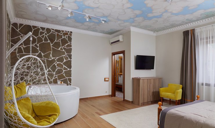 В номере: вешалка, диван, зеркало, кровать двуспальная, прикроватные тумбочки, стол, стулья, шкаф, кондиционер, мини-холодильник, телевизор, телефон, холодильник