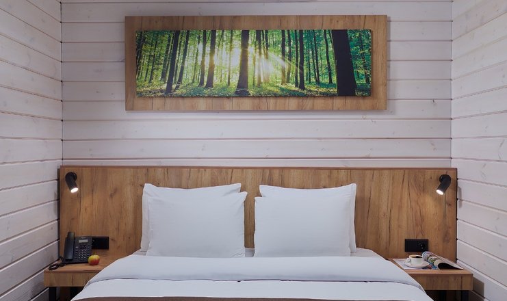 В номере: вешалка, диван, зеркало, кровать двуспальная, прикроватные тумбочки, стол, стулья, шкаф, Мини-кухня, микроволновая печь, набор посуды, плита электрическая, телевизор, телефон, холодильник, чайный набор посуды, электрочайник