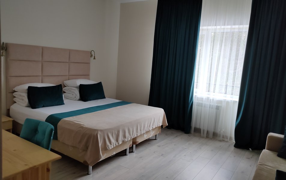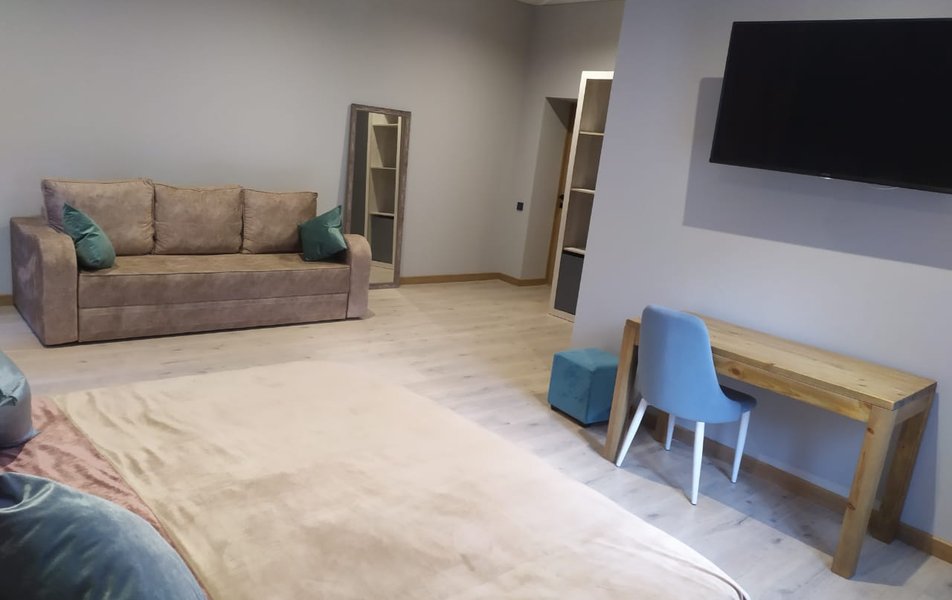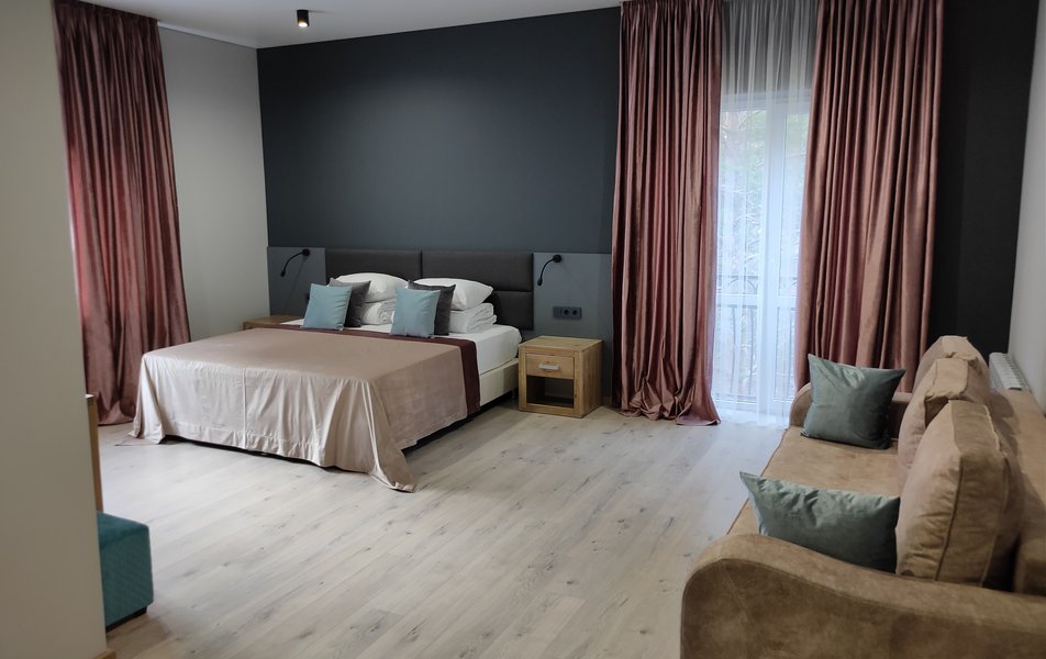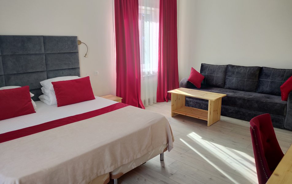 В номере: вешалка, зеркало, диван, кровати односпальные /одна двуспальная кровать, прикроватные тумбочки, стол, стул, шкаф, мини-холодильник, набор посуды, телевизор, электрочайник