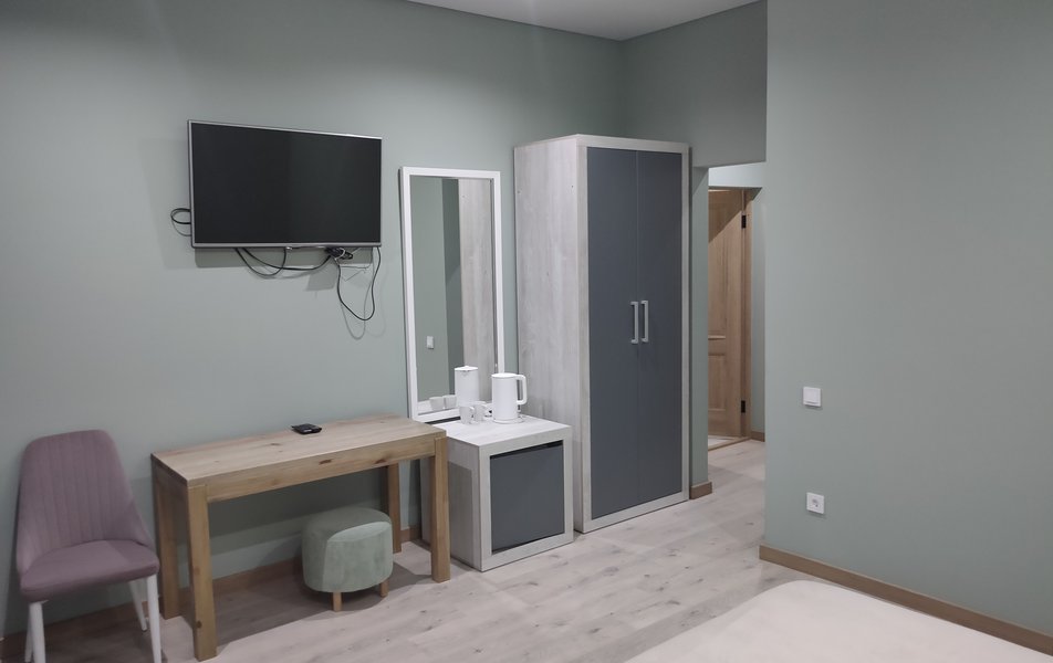 В номере: вешалка, зеркало, кровати односпальные /одна двуспальная кровать, прикроватные тумбочки, стол, стул, шкаф, мини-холодильник, набор посуды, телевизор, электрочайник
