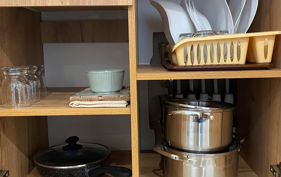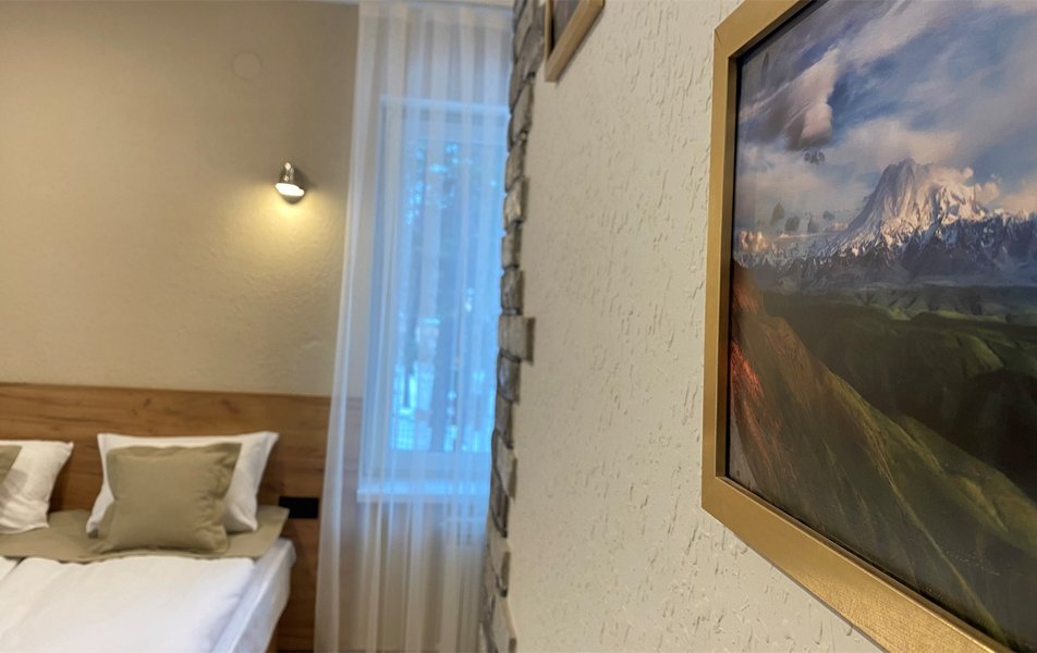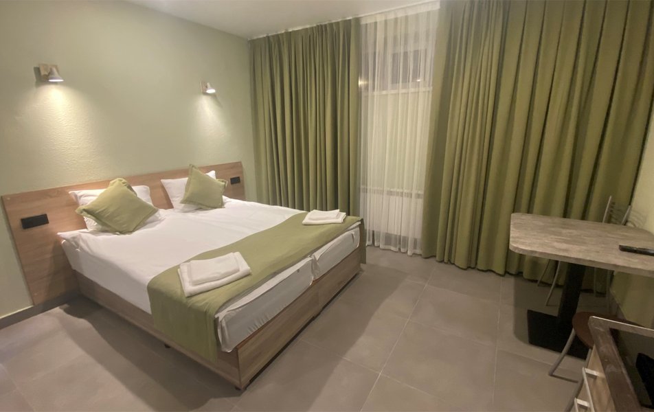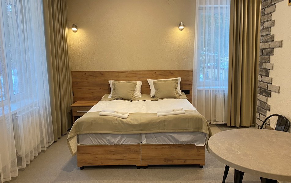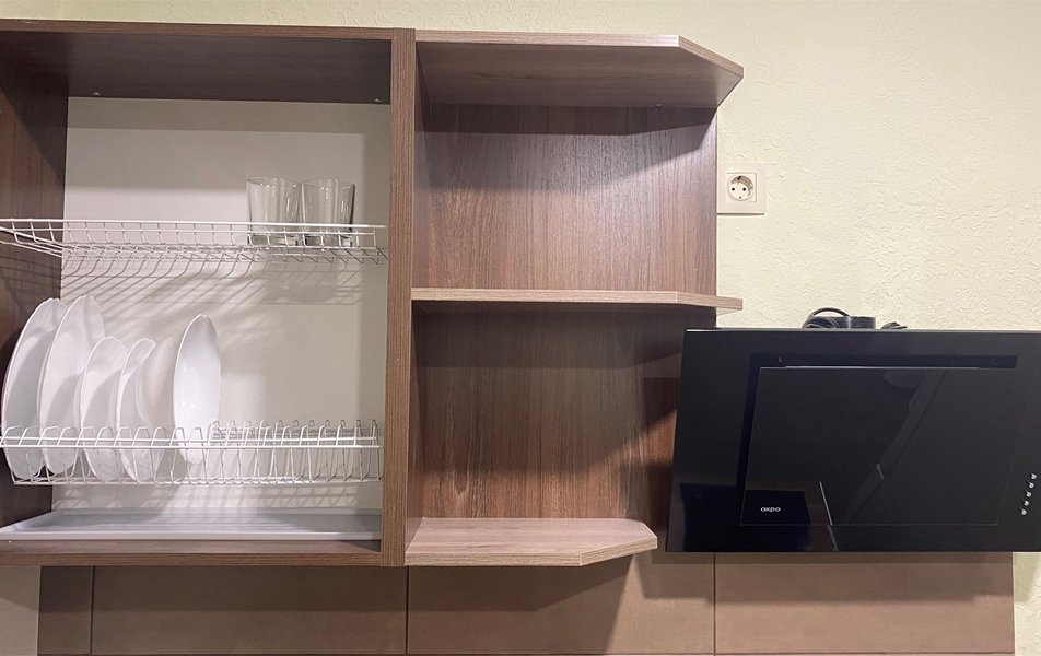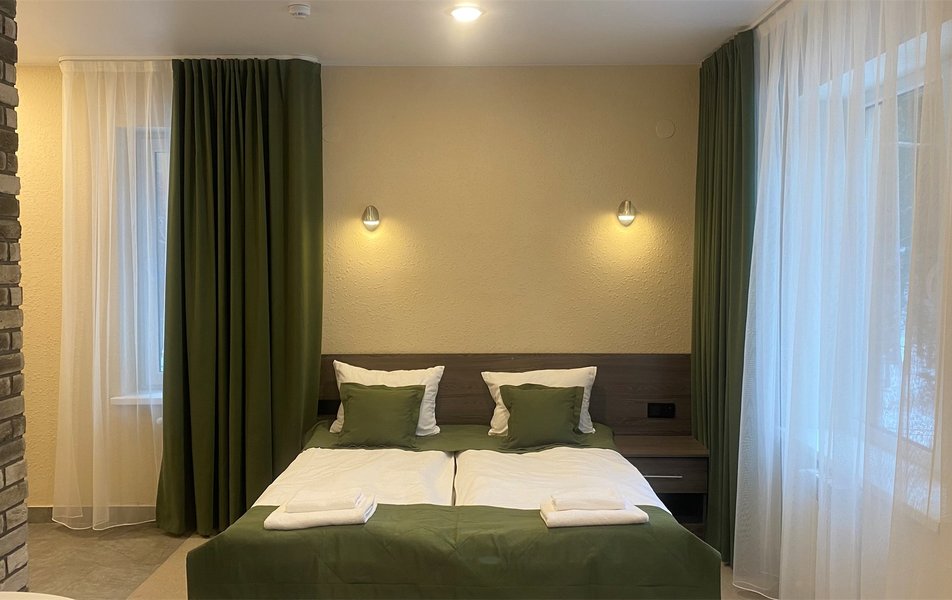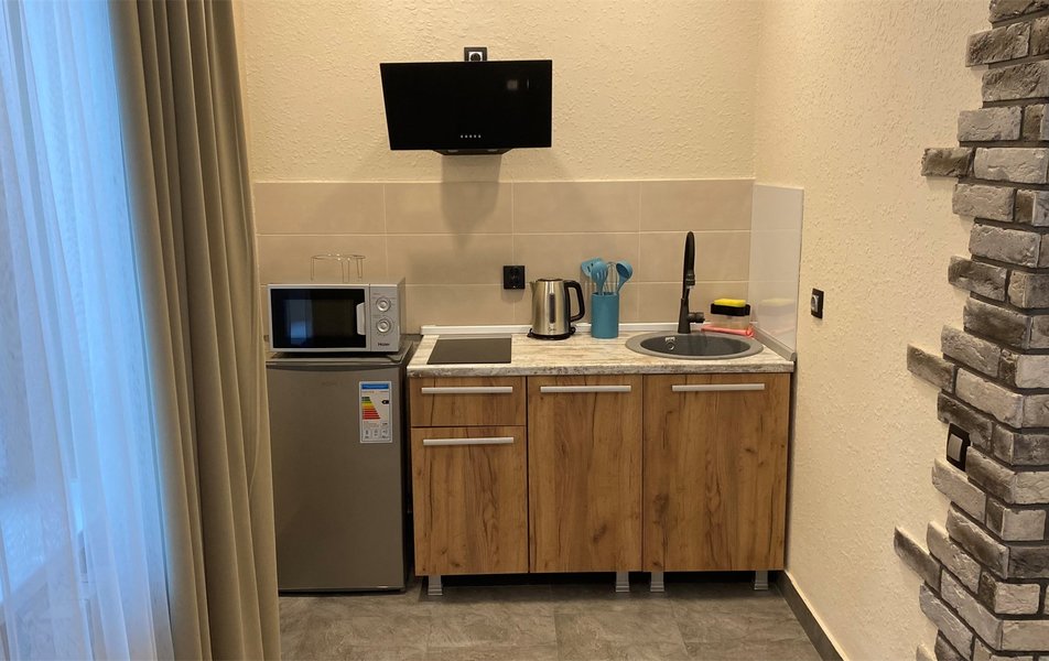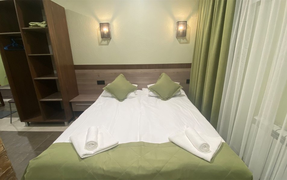 В номере: вешалка, диван раскладной, зеркало, кровати односпальные /одна двуспальная кровать, прикроватные тумбочки, стол, стулья, шкаф, мини-кухня, микроволновая печь, набор посуды, телевизор, холодильник, чайный набор посуды, электрочайник