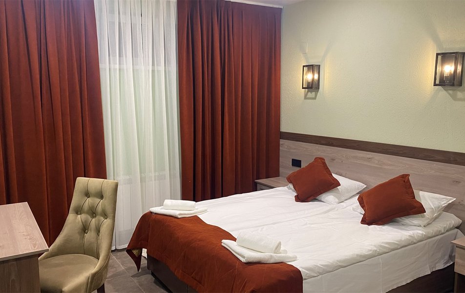 В номере: вешалка, диван раскладной, зеркало, кровати односпальные /одна двуспальная кровать, прикроватные тумбочки, стол, стулья, шкаф, мини-кухня, микроволновая печь, набор посуды, плита электрическая, телевизор, холодильник, чайный набор посуды, электрочайник