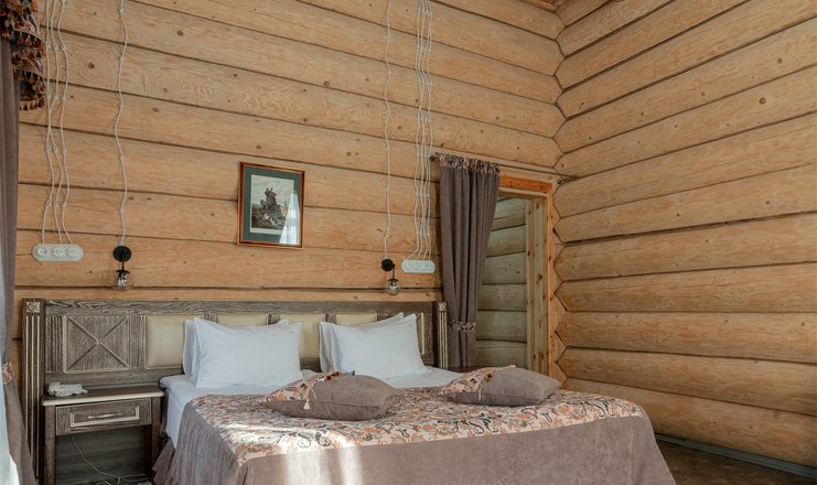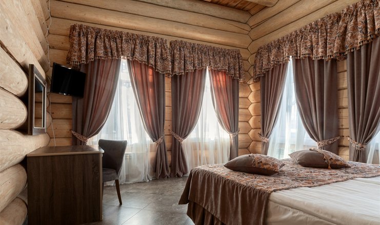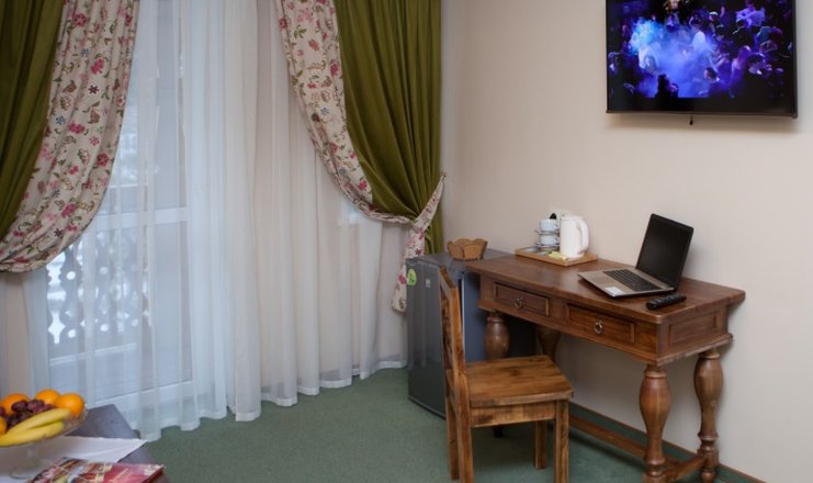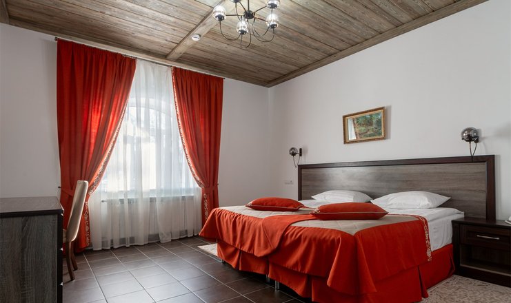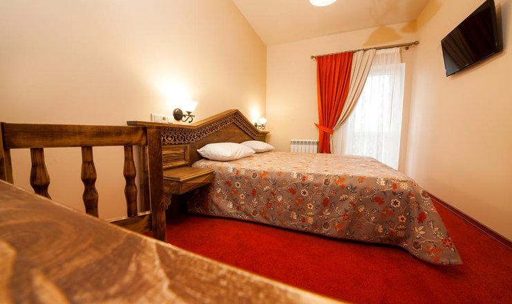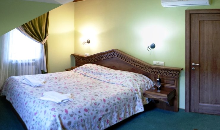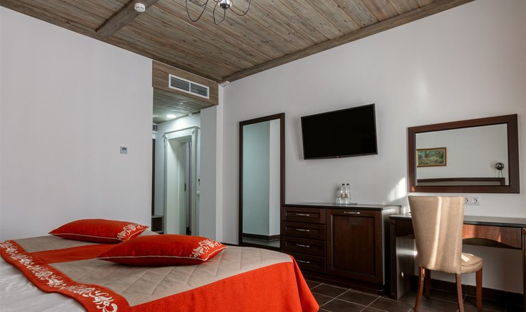 В номере: вешалка, диван раскладной, зеркало, кровать двуспальная, прикроватные тумбочки, стол, стулья, шкаф, кондиционер, мини-холодильник, телевизор ЖК