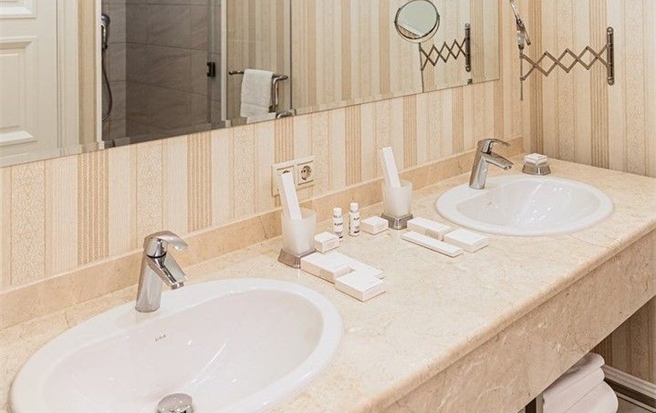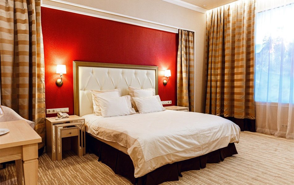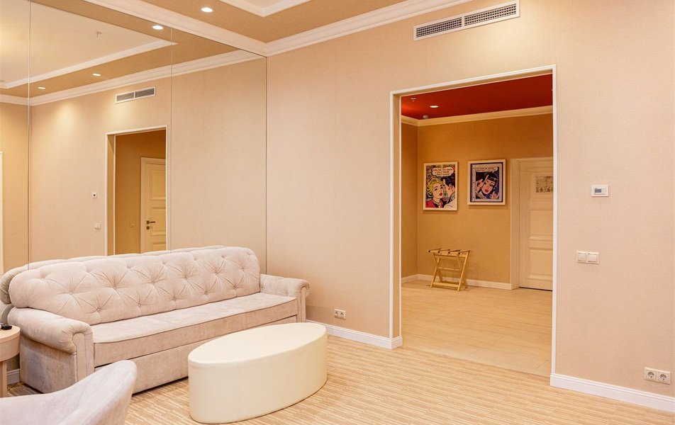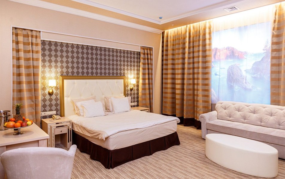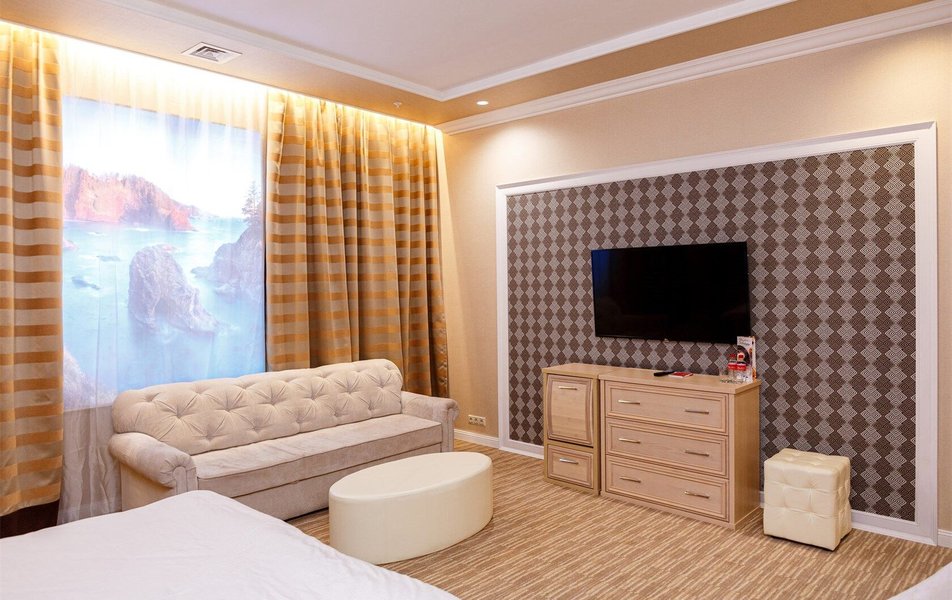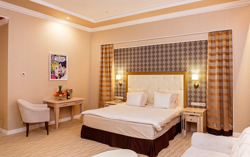 В номере: вешалка, зеркало, диван, кровать двуспальная, прикроватные тумбочки, стол, стулья, шкаф, кондиционер, сейф, телевизор, телефон, холодильник