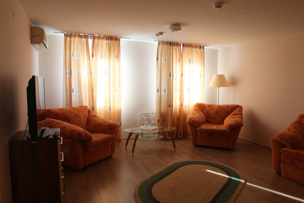В номере: одна двуспальная либо две односпальные кровати, прикроватные тумбы, шкаф, стол, стулья, журнальный столик, мягкая мебель, кондиционер, спутниковое телевидение, холодильник, электрочайник
