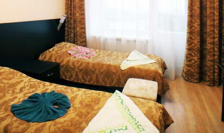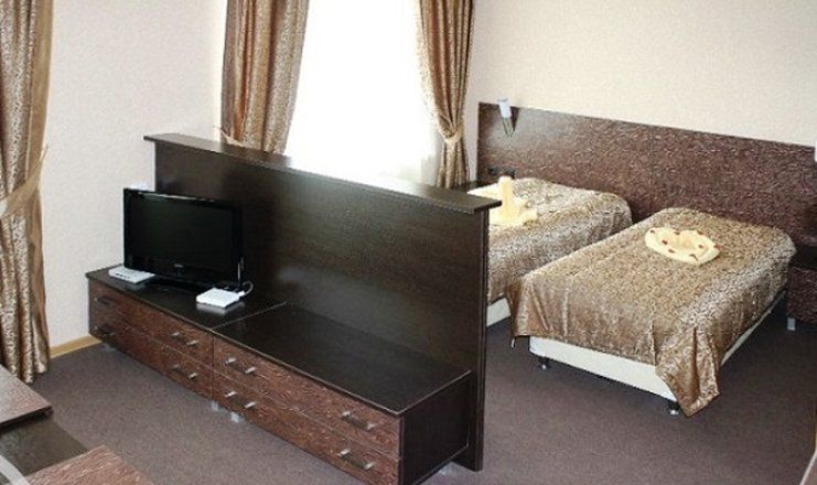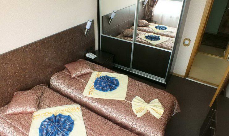 В номере: кровати односпальные, прикроватные тумбочки, стол, стул, шкаф-купе, мини-холодильник, набор посуды, сейф, телевизор