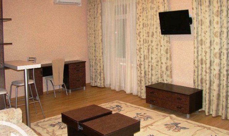 В номере: две комнаты: спальня и гостиная, кровати односпальные, прикроватные тумбочки, стол, стул, диван, шкаф-купе, журнальный стол, кондиционер, мини-холодильник, набор посуды, сейф, телевизор, чайный набор посуды, электрочайник