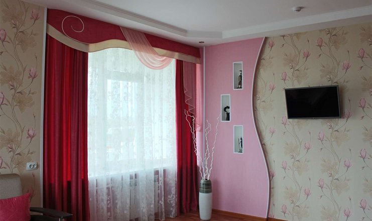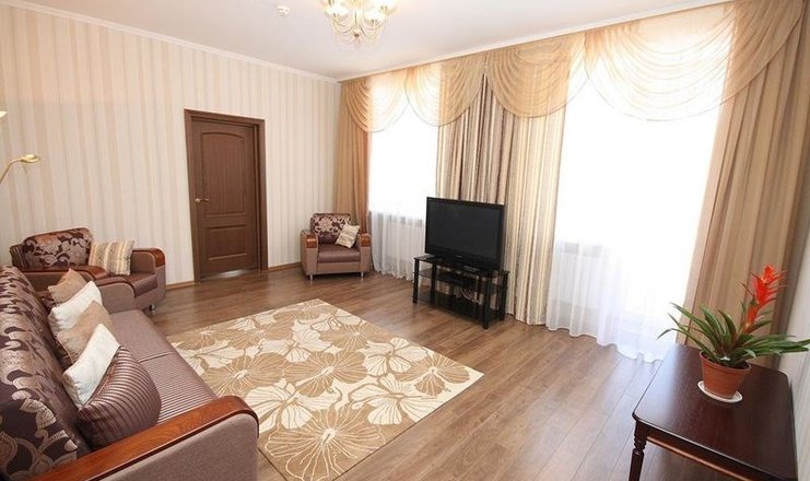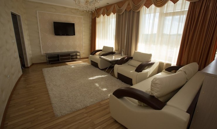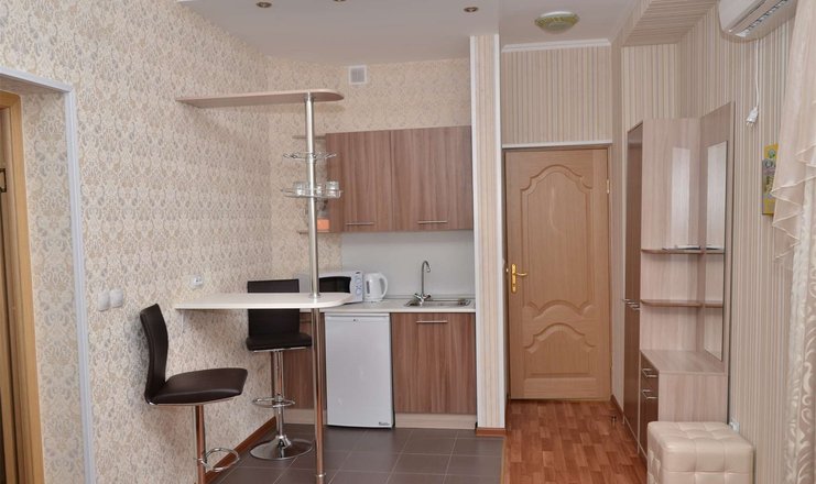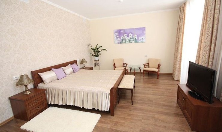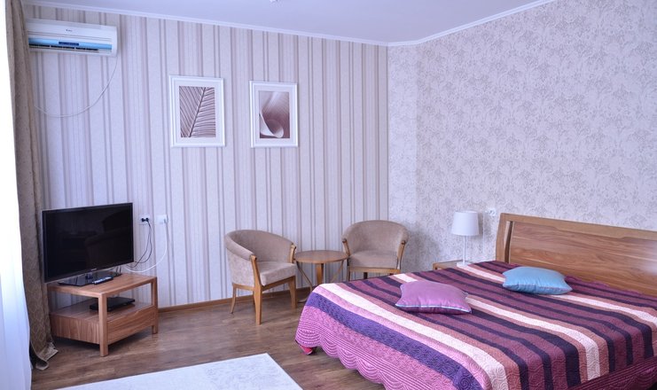 В номере: диван раскладной, кровать двуспальная, прикроватные тумбочки, столик журнальный, стулья, шкаф, мини-кухня, гладильная доска, кондиционер, микроволновая печь, набор посуды, телевизор, утюг, холодильник, электрочайник