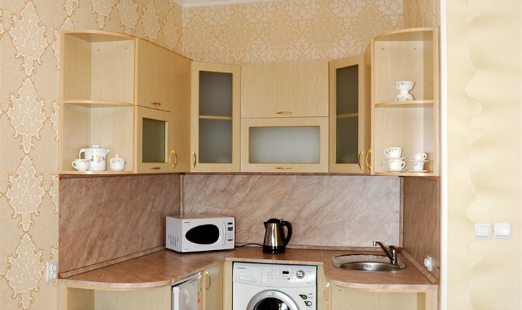 В номере: кровать двуспальная, кухонная мебель, прикроватные тумбочки, стол, столик журнальный, стулья, шкаф, мягкая мебель, гладильная доска, кондиционер, микроволновая печь, набор посуды, сейф, стиральная машина, сушилка для белья, телевизор, утюг, холодильник, электрочайник
