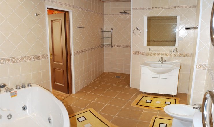 Санузел: джакузи, раковина, унитаз, биде, тапочки, туалетные принадлежности, фен