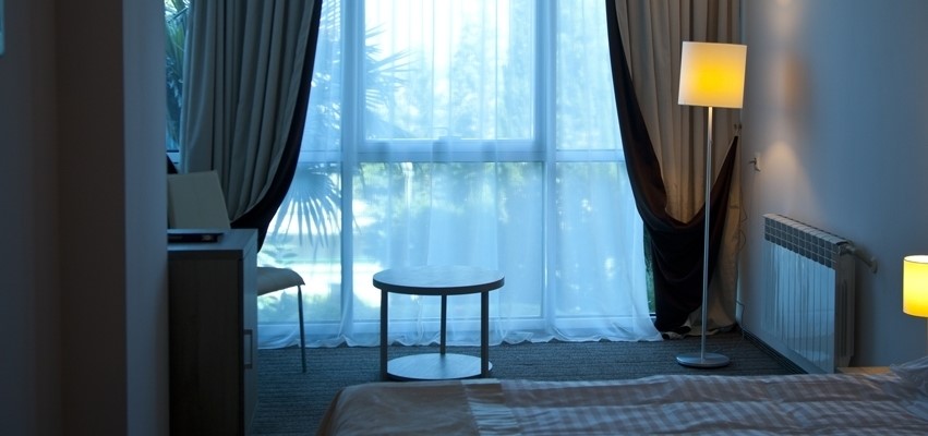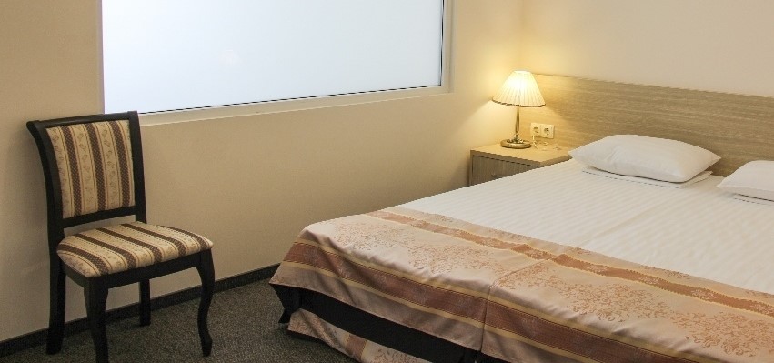 В номере: две односпальные кровати, платяной шкаф, прикроватные тумбы, туалетный столик, стулья, дополнительное место - кресло, набор посуды, холодильник, телевизор, кондиционер