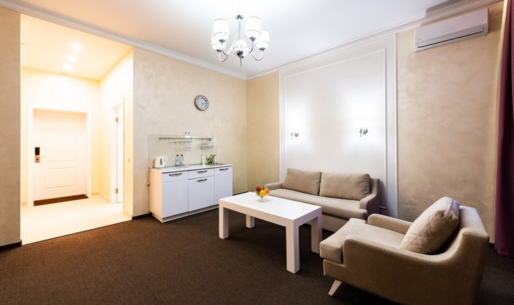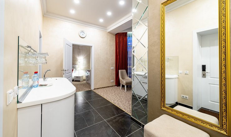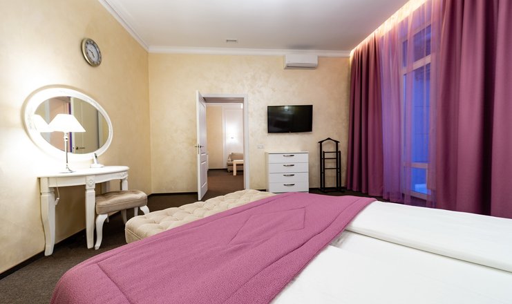 В номере: вешалка, гардеробная, диван, зеркало, комод, кресла, кровать двуспальная, набор мягкой мебели, прикроватные тумбочки, стол, столик туалетный, шкаф, шкаф-купе, мини-кухня, кондиционер, мини-холодильник, телевизор ЖК, утюг, чайный набор посуды, электрочайник