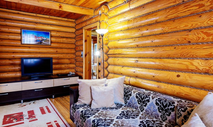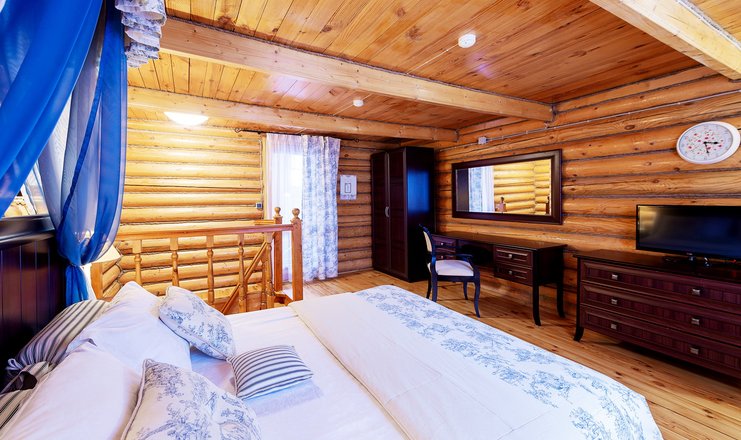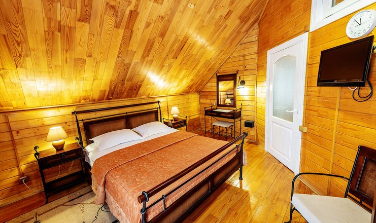 В коттедже: кровать двуспальная, набор мягкой мебели, прикроватные тумбочки, стол, столик туалетный, шкаф, мини-кухня, гладильная доска, микроволновая печь, плита электрическая, сейф, стиральная машина, телевизор ЖК, утюг, холодильник, чайный набор посуды, электрочайник