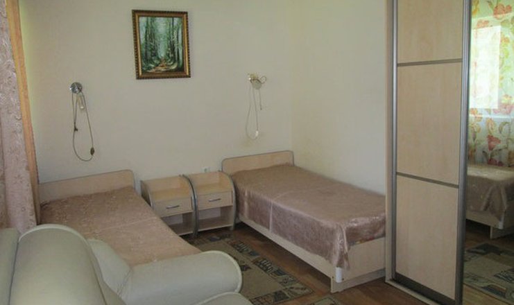 В номере: зеркало, кресло, кровати односпальные, прикроватные тумбочки, стол, стулья, шкаф, мини-холодильник: на блок, телевизор, чайный набор посуды, электрочайник