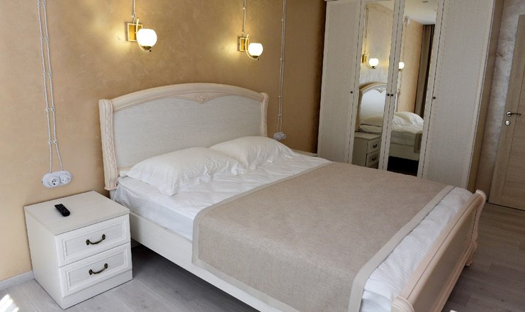В номере: стол, 2 стула, шкаф, гладильная доска, кондиционер, микроволновая печь, телевизор, утюг, холодильник, электрочайник, мягкая мебель, 2 односпальные кровати, двуспальная кровать (ширина 160 см), кухонный гарнитур, WI-FI, набор полотенец, расширенный набор посуды, предметы индивидуального пользования.