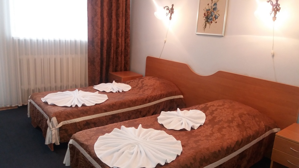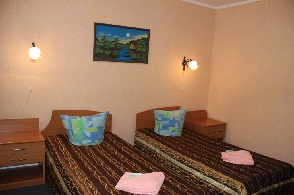 В номере: две односпальные кровати, прикроватные тумбы, стол, стул, шкаф, телевизор, холодильник, электрочайник, утюг с гладильной доской, сушилка для белья