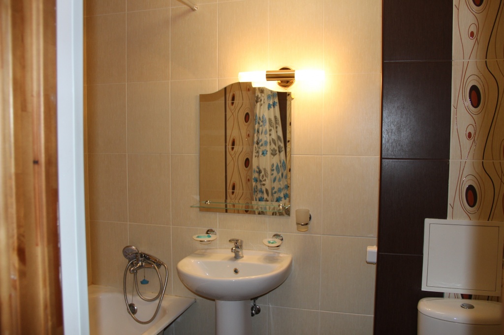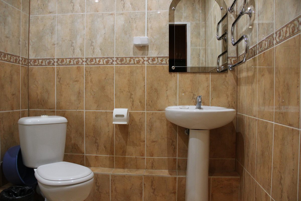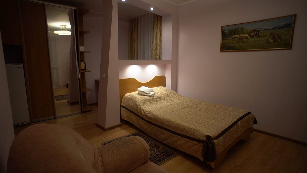 В номере: двуспальная кровать, прикроватные тумбы, стол, стулья, шкаф, телевизор, холодильник, электрочайник, утюг с гладильной доской, сушилка для белья, набор посуды