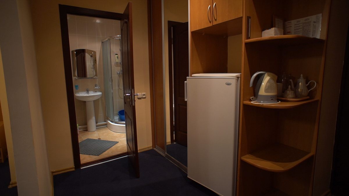 В номере: односпальная кровать, прикроватная тумба, стол, стулья, шкаф, кресло, телевизор, холодильник, электрочайник, утюг с гладильной доской, сушилка для белья, набор посуды