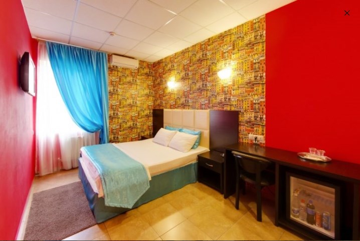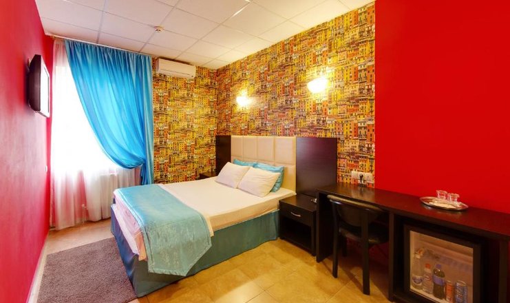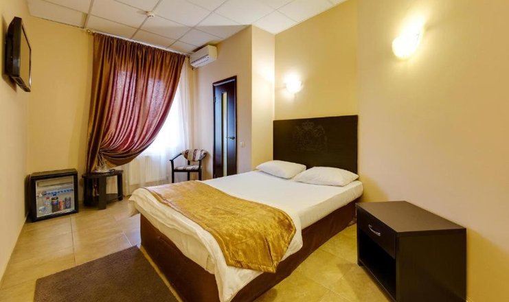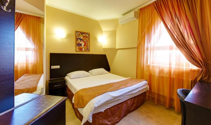 В номере: вешалка, зеркало, кровать двуспальная, прикроватные тумбочки, стол, стулья, шкаф, мини-холодильник, набор посуды, сплит-система, телевизор