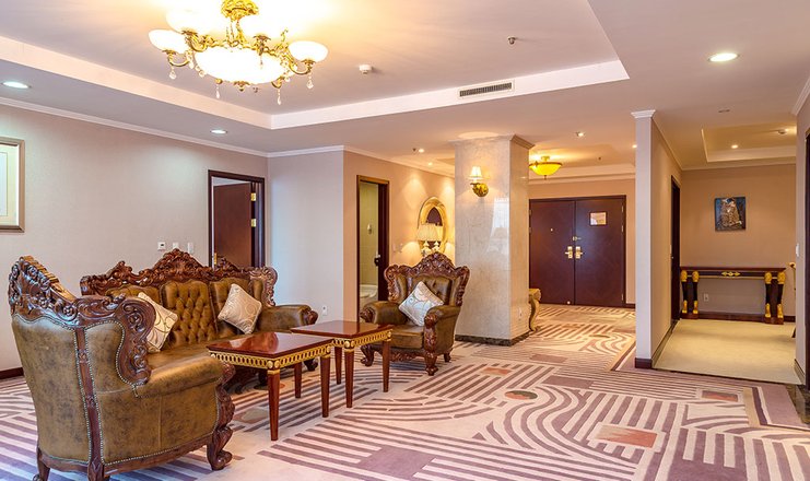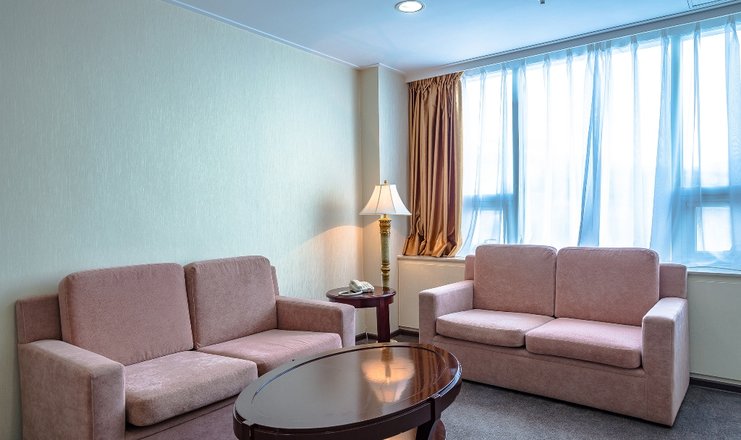 В номере: вешалка, зеркало, кровать двуспальная: 2, набор мягкой мебели, стол, стулья, шкаф, Мини-кухня, сейф, сплит-система, телевизор, телефон, холодильник, чайный набор посуды, электрочайник