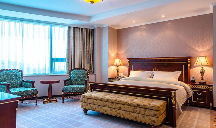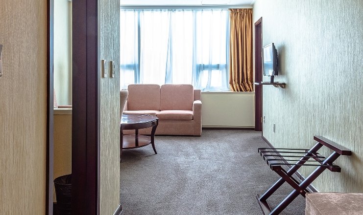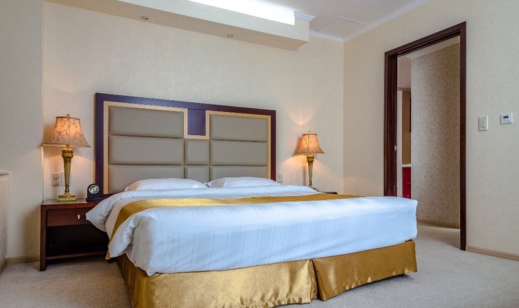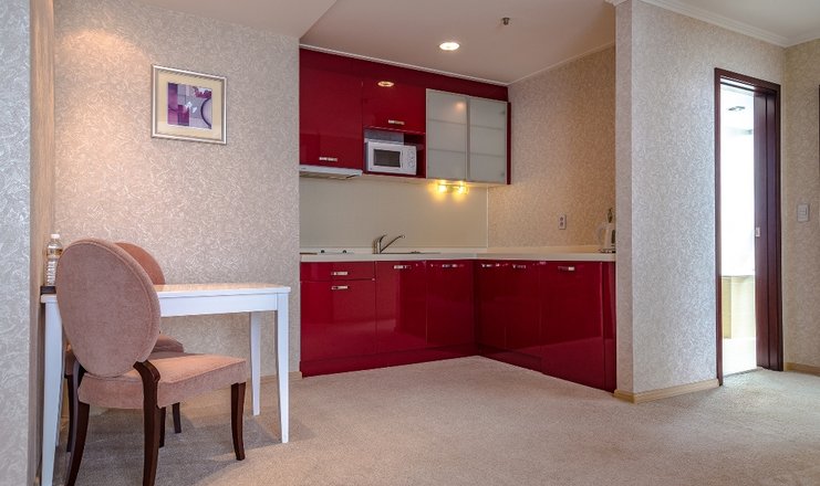 В номере: вешалка, зеркало, кровать двуспальная, набор мягкой мебели, прикроватные тумбочки, стол, стулья, шкаф, Мини-кухня, мини-холодильник, сейф, сплит-система, телевизор, телефон, электрочайник
