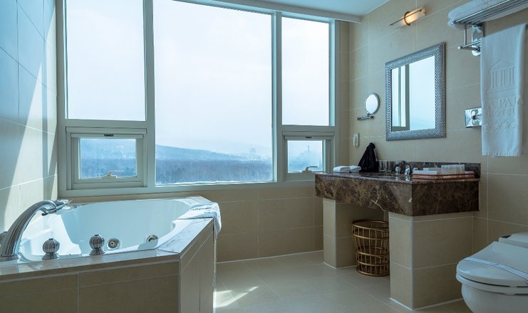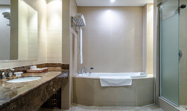Санузел: с ванной, с джакузи, с душем, тапочки, туалетные принадлежности, фен, халат