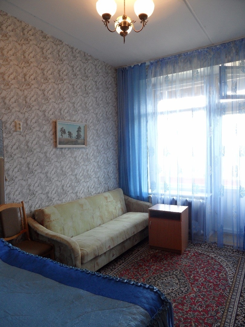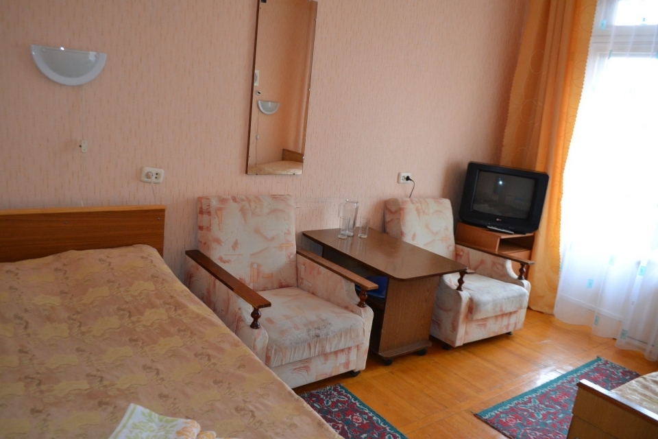 В номере: 24 кв.м., холодильник, телевизор, шкаф для верхней одежды, мини-стенка с посудой, кровать 2 сп., диван, 2 стула, 2 тумбочки, журнальный столик. Возможно дополнительное место.