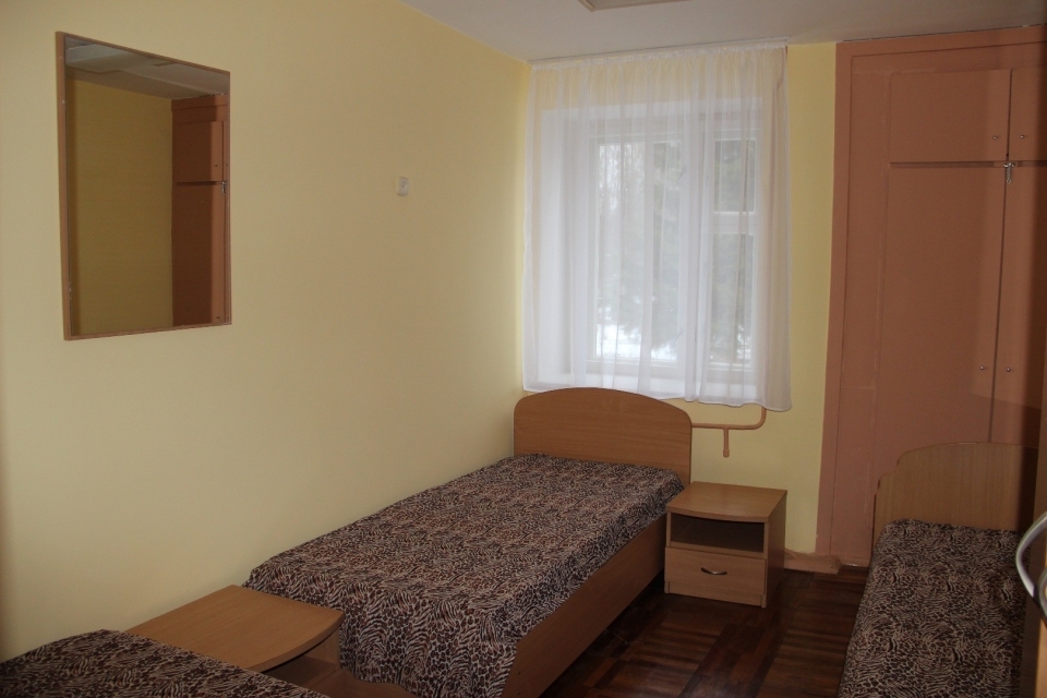 В номере: 12 кв.м., 3 кровати 1,5 сп, 3 тумбочки, шкаф для одежды.