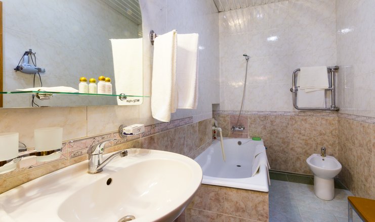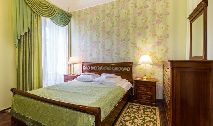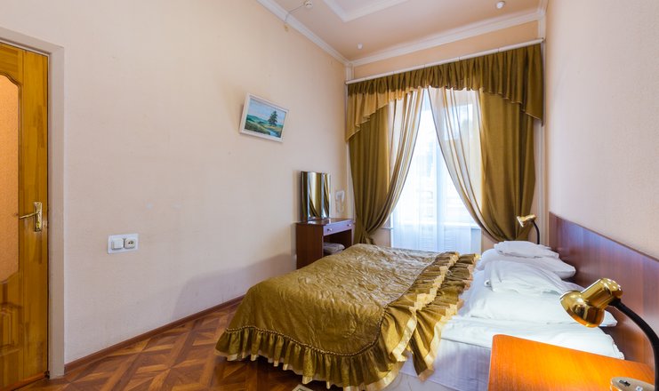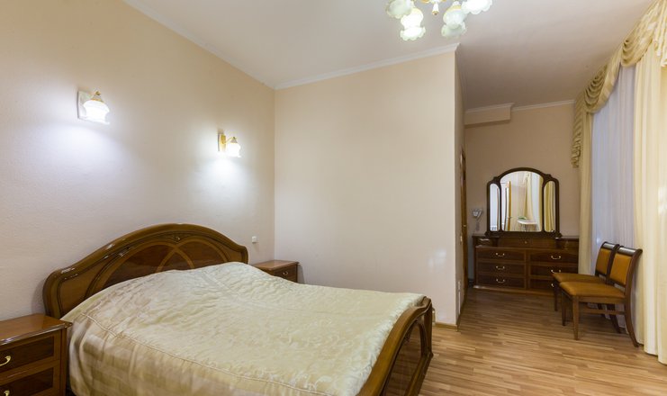 В номере: вешалка, диван, зеркало, кресла, кровать двуспальная, прикроватные тумбочки, стол, столик туалетный, стулья, шкаф, телевизор, холодильник, чайный набор посуды, электрочайник